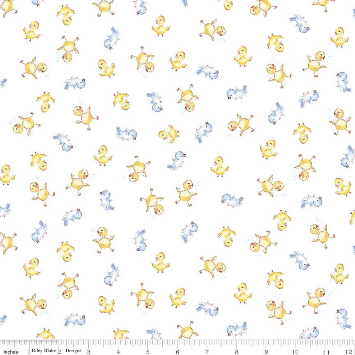 Fabric shows darling baby birds and baby chicks on a crisp, white background.