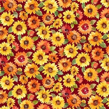 colors of sunflowers on a burgandy background...perfect for your autumn sewing needs.