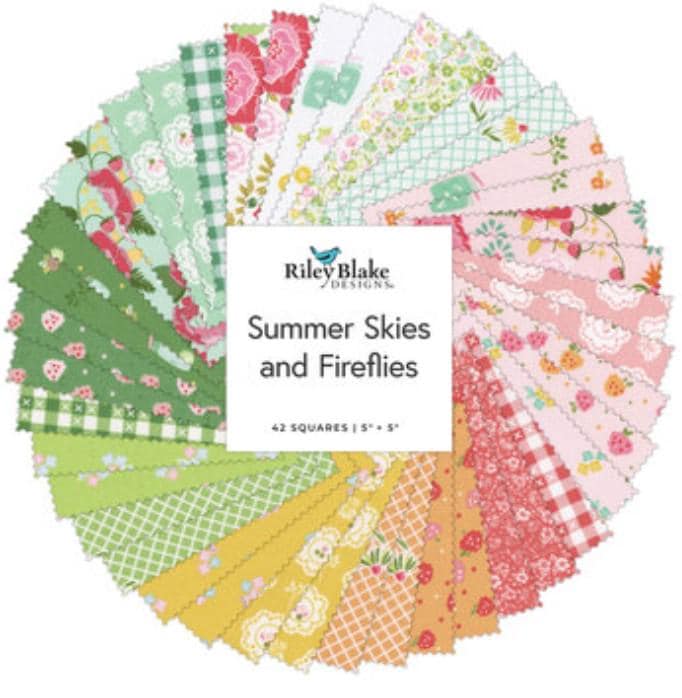 This is a 5" Stacker Charm Pack precut bundle includes 42 pieces from Summer Skies and Fireflies collection for Riley Blake Designs.