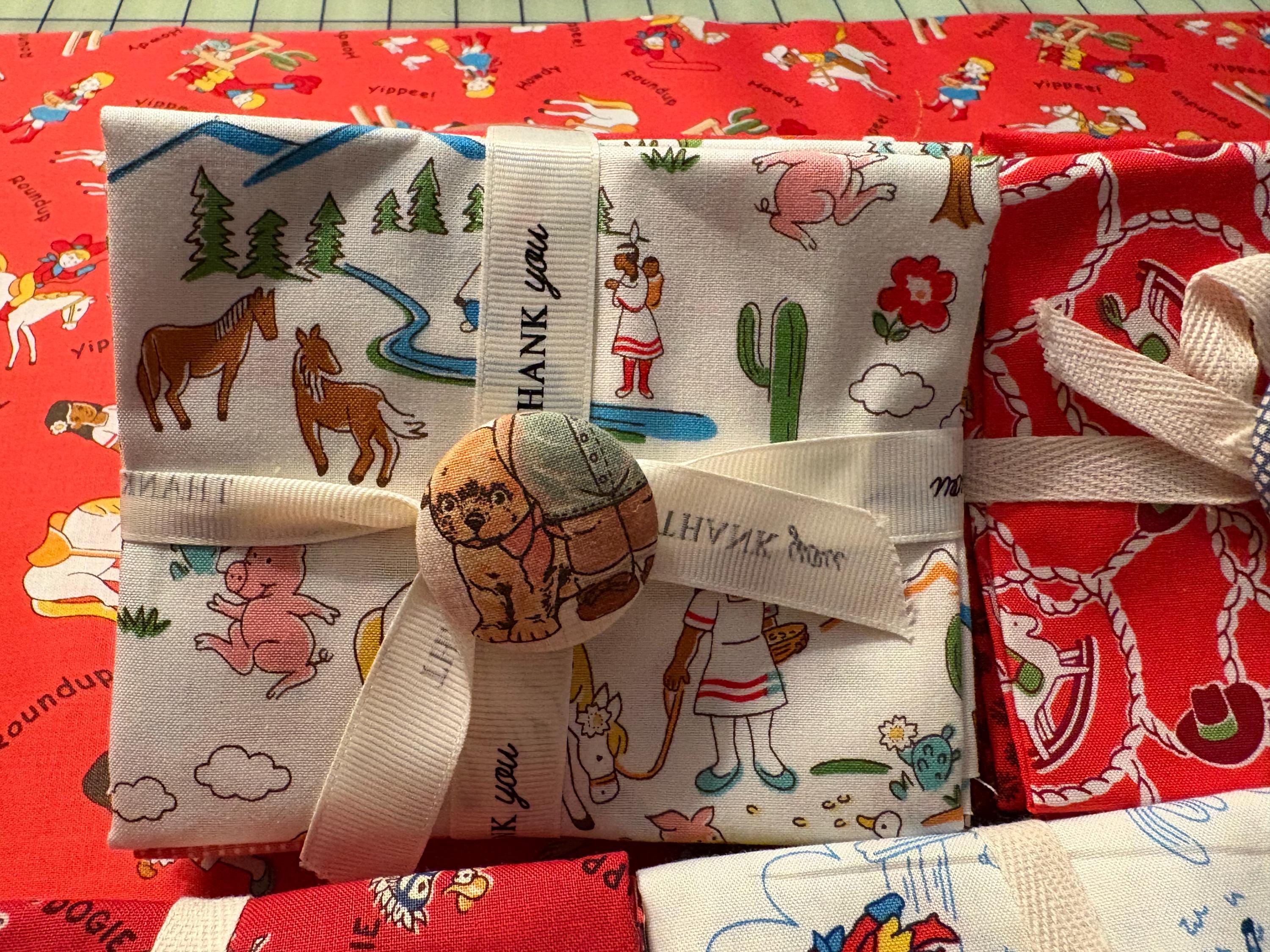 Bundle 5. THIS OPTION SOLD OUT. Pink fat quarter bundle pack with Puppy Dog button on ribbon. Contains 6 fat quarters from cowboys and prairie women with wagons also Indians, to pink pinks on geometric pattern, farm florals, lassos and cowboy hats with rocking horses. This option is called: Pink Pack with Dog