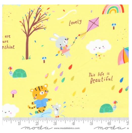 The Yellow Print show what life is like outside and says Life is Beautiful, You are Pure Sunshine and more LOVELY sayings on this darling children's print. Print shows super cute animals playing in the weather. The bunny is flying a kite in the wind, the tiger is enjoying the sun in his sunglasses, The mouse and tiger are jumping in puddles, Some are enjoying the rainbow colored raindrops, and the darling little turtle has his own tiny umbrella. The bunny flying the kite measures 1.5" tall. The cloud next to him measures 1.25" wide. Background is Lemon Yellow.