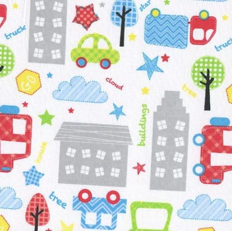 The car and truck fabric shows all types of vehicles going about in a city...so cute. It has tall buildings, trees, clouds, stars and more. Background is white.