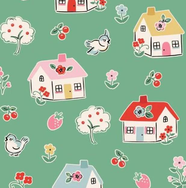 The green Houses fabric shows the most adorable little houses in a village complete with blue birds.