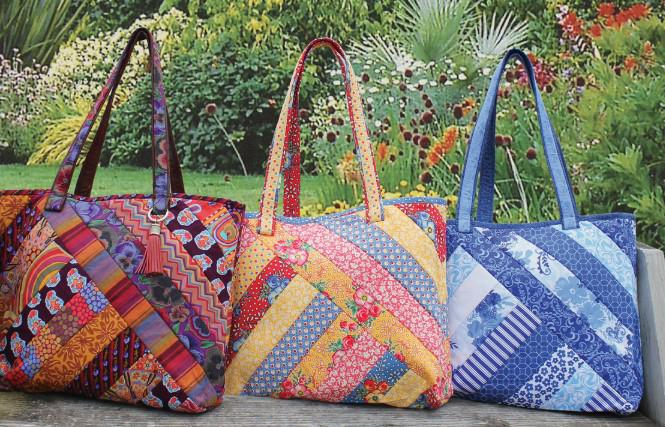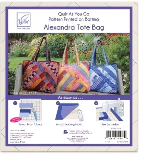 Quilt As You Go Alexandra Tote Bag design. Tote pattern printed directly onto quilt batting for sew by number construction - piece and quilt all at once. FAST GIFT IDEA. Designed to work with 2.5" strips. Webbing provided for extra stability in the strapping. All you need is fabric scraps.