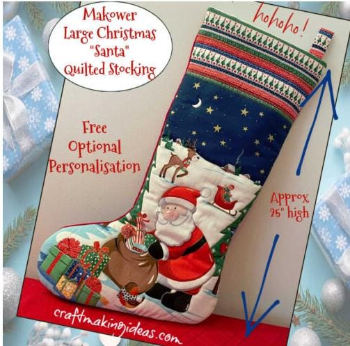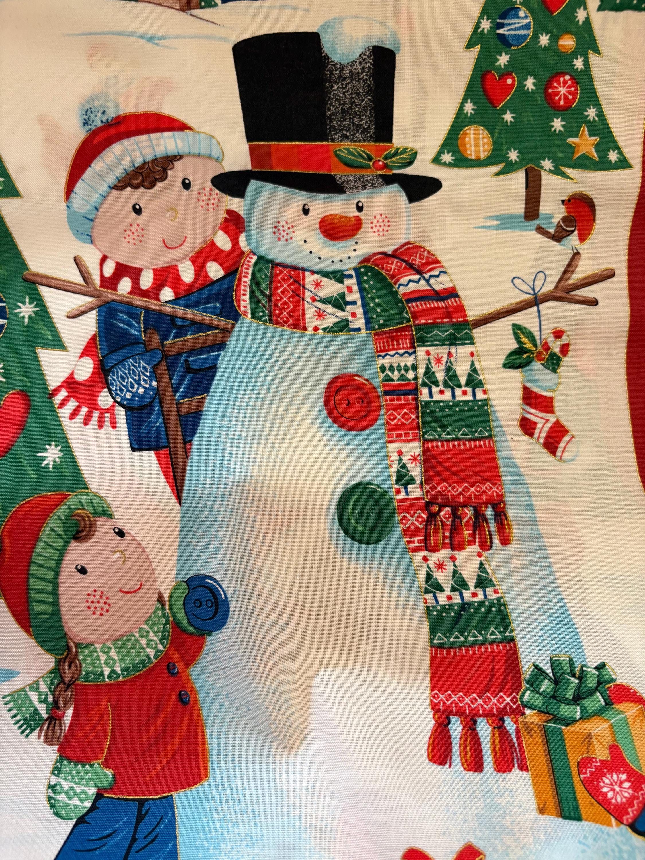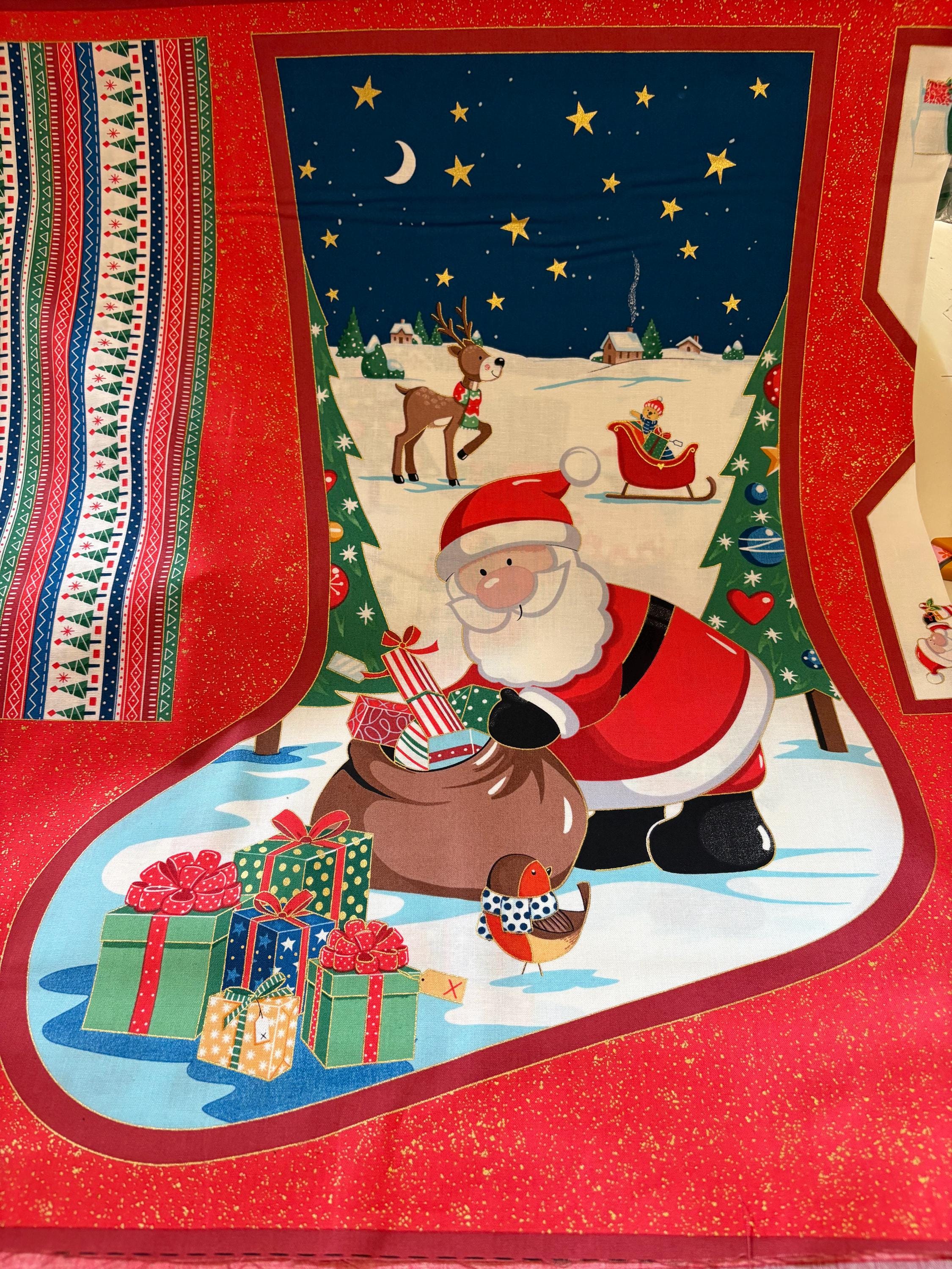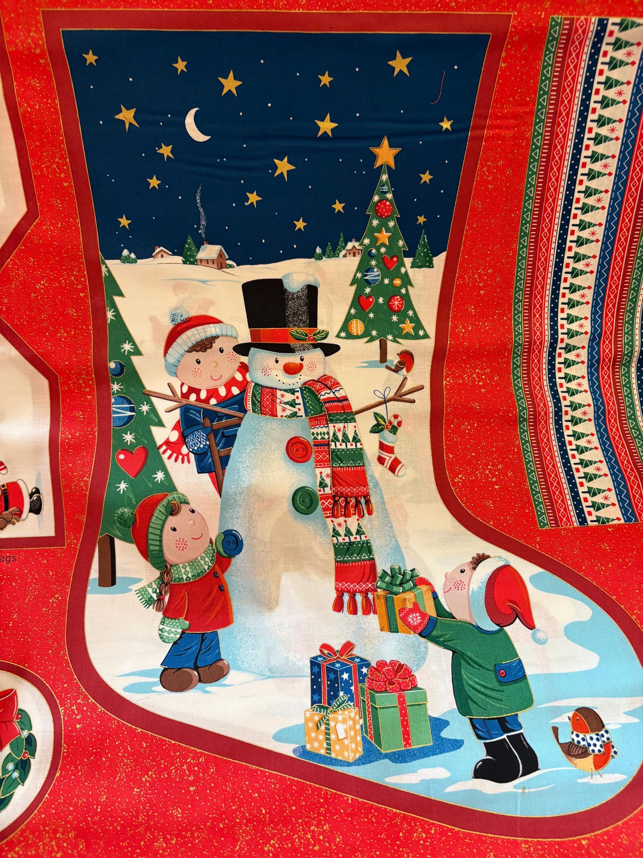 Straight from the UK...These darling Christmas stockings are large measuring approx. 25" tall. Each panel gives you the front fabrics to make two large Christmas stockings one featuring Santa and one showing a Snowman and children. Also included are fabric Christmas tags and fabric for making the hanging loops. You provide batting, lining and backing fabric.