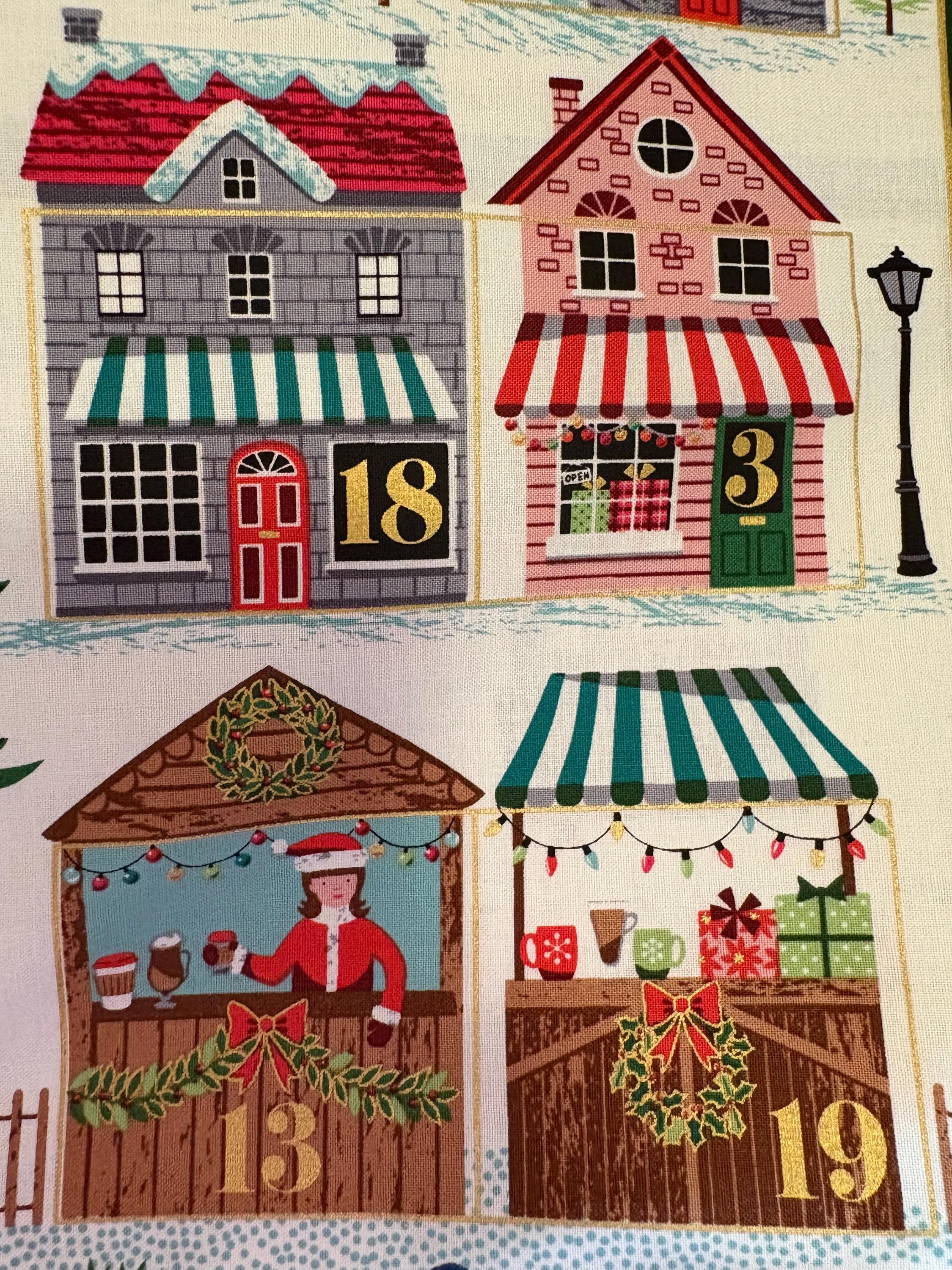Straight from the UK...This darling advent calendar is fast to sew up. Each day before Christmas, there is a pocket in which you can put little candy canes or gifts for children to get before the big day. This calendar shows ice skaters, skiers, Christmas shoppers, and many more people preparing for Christmas in the snowy village.