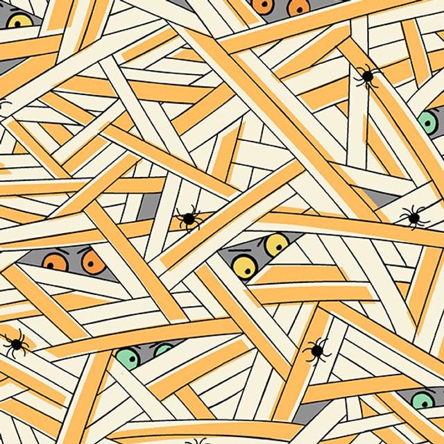 This is the cutest Halloween fabric I think we have ever carried in our shop. It is much cuter than in the photo. This print shows mummies who have lost their wrappings, and they are peeking out from behind the wrappings. They have different colored eyes too. So cute.