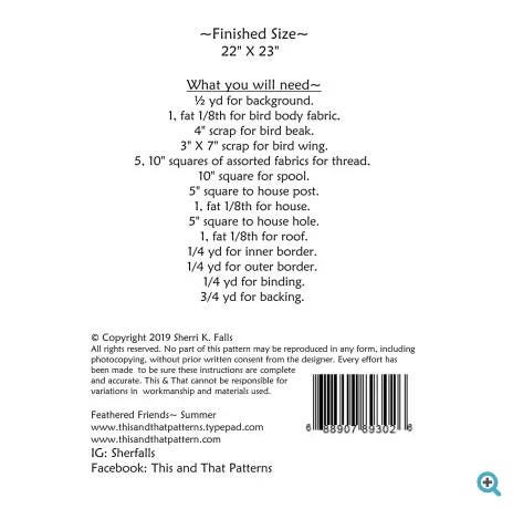 This mini quilt shows a bird resting on a large spool of thread along with a bird house being held up by a spool of thread. Great border too.