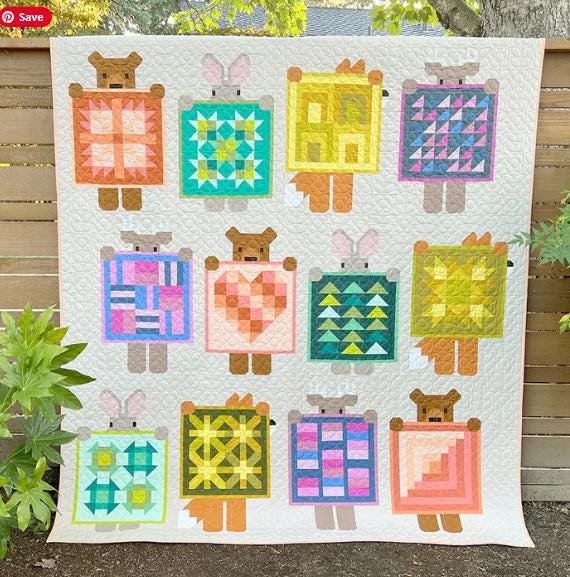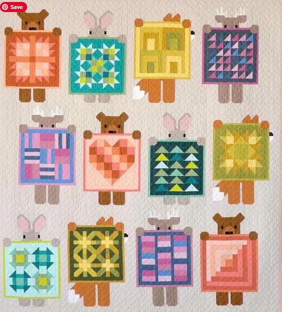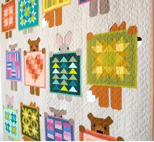 This is perhaps the CUTEST pattern booklet of the year. This pattern is called Show and Tell, and it shows all of the animals showing off their latest quilts. Each quilt they show is different. My favorite is the fox holding up his quilt and peeking from behind the quilt.