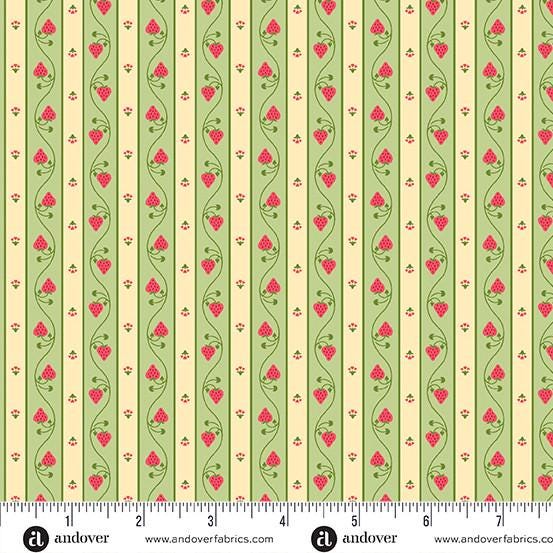This is such a dreamy fabric called Strawberry Honey. It is a stripe with tiny strawberries growing up and down the green and cream.