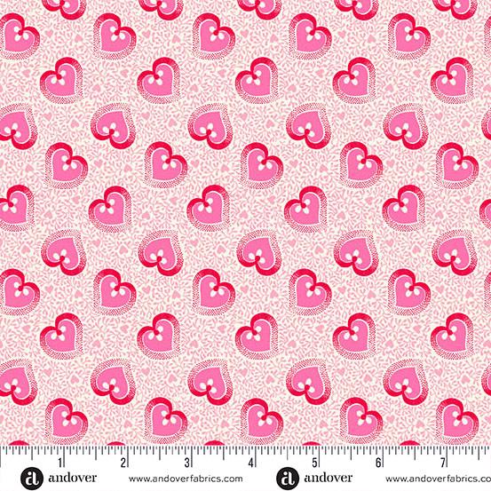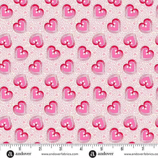 This fabric is yummy pink hearts surrounded by the tiniest of hearts on the background pink hearts and vines on a white background. Use as a main print or a blender.