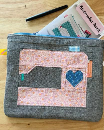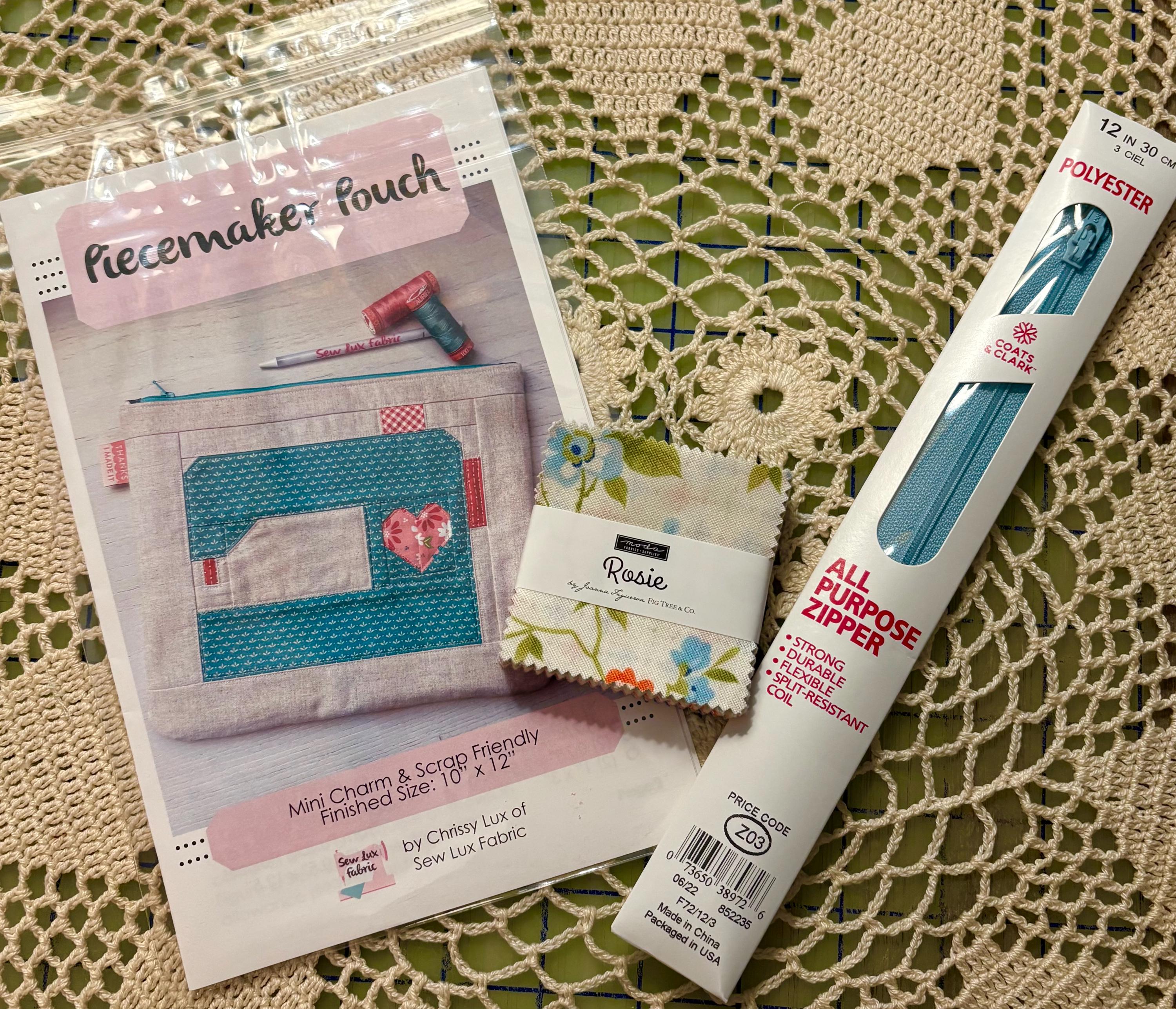 Kit includes: Piecemaker Pouch pattern, one mini charm pack called Rosie by Moda, one 12" Coats and Clark blue zipper to compliment the colors in the fabric.