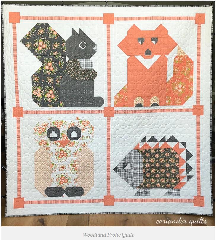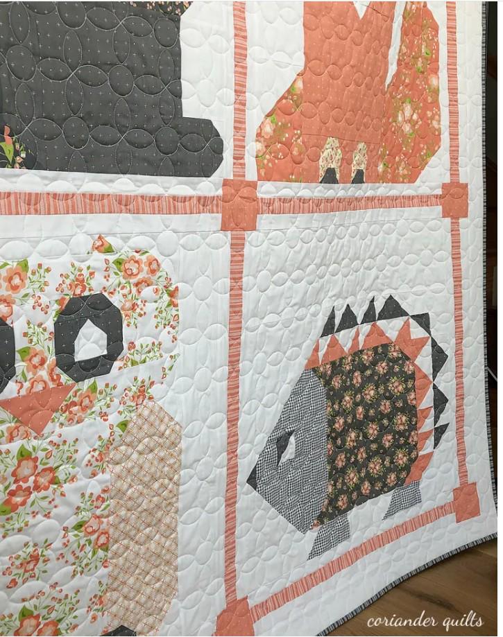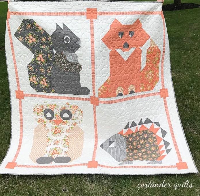 These friends are ready to keep your little one comfy and cozy. This quilt pattern is called Woodland Frolic by Coriander Quilts. The quilt shows a chipmunk/squirrel, fox, owl and hedgehog. They are adorable.