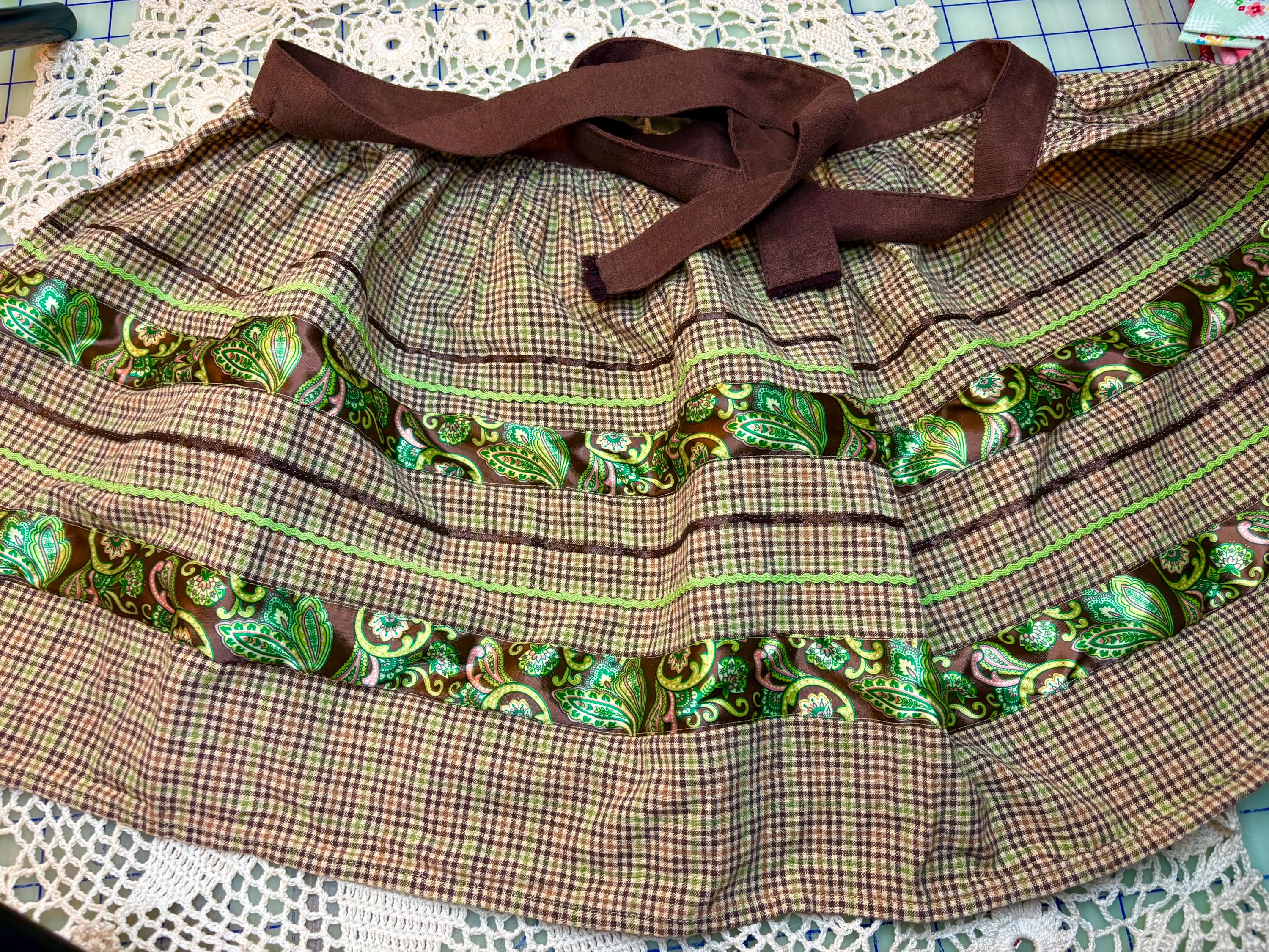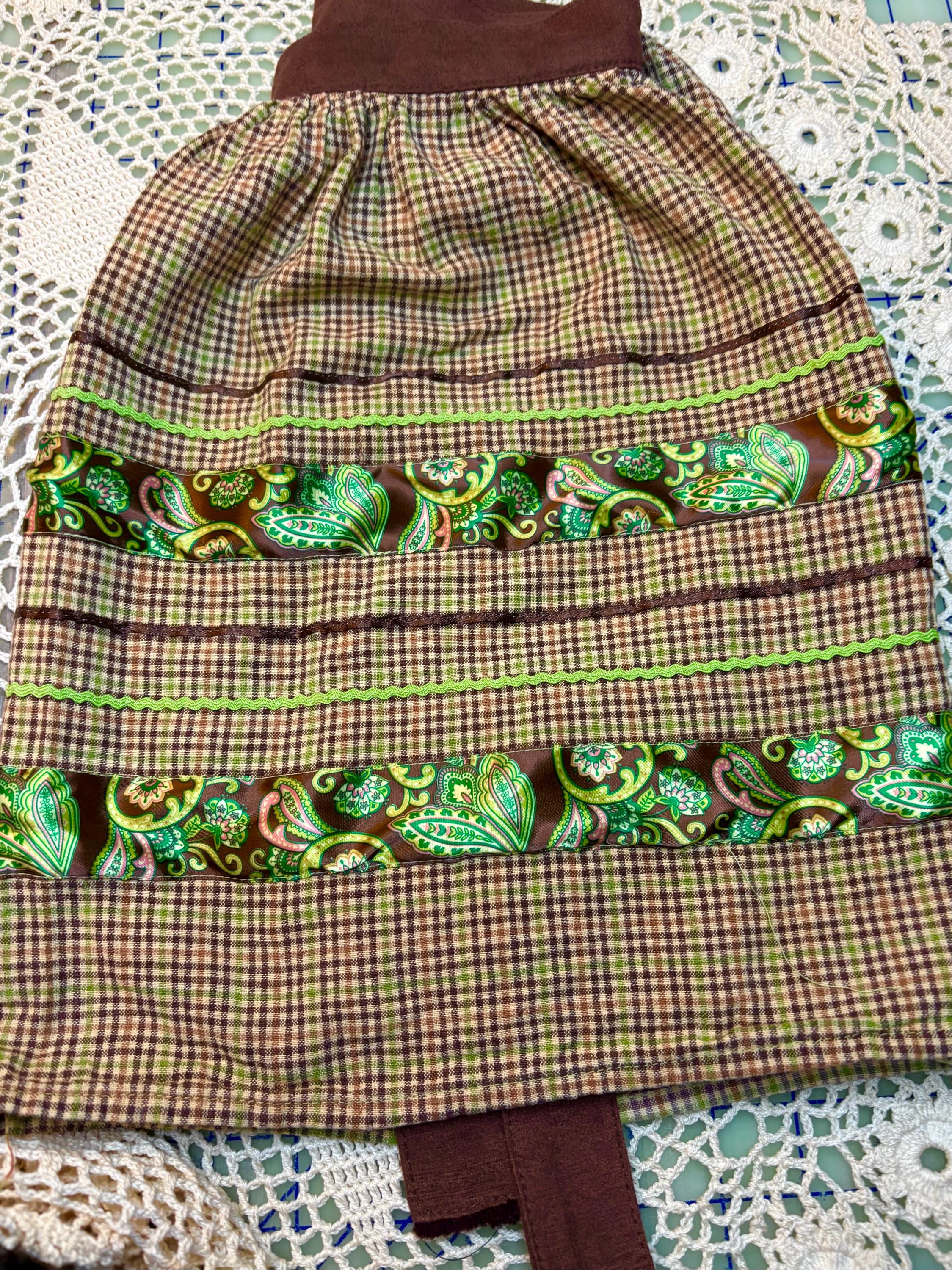 6. One Vintage Brown and Green Apron. Fits up to size 1 to 2X. Tie measures 58.5" long. Hard to find plus size vintage aprons.
