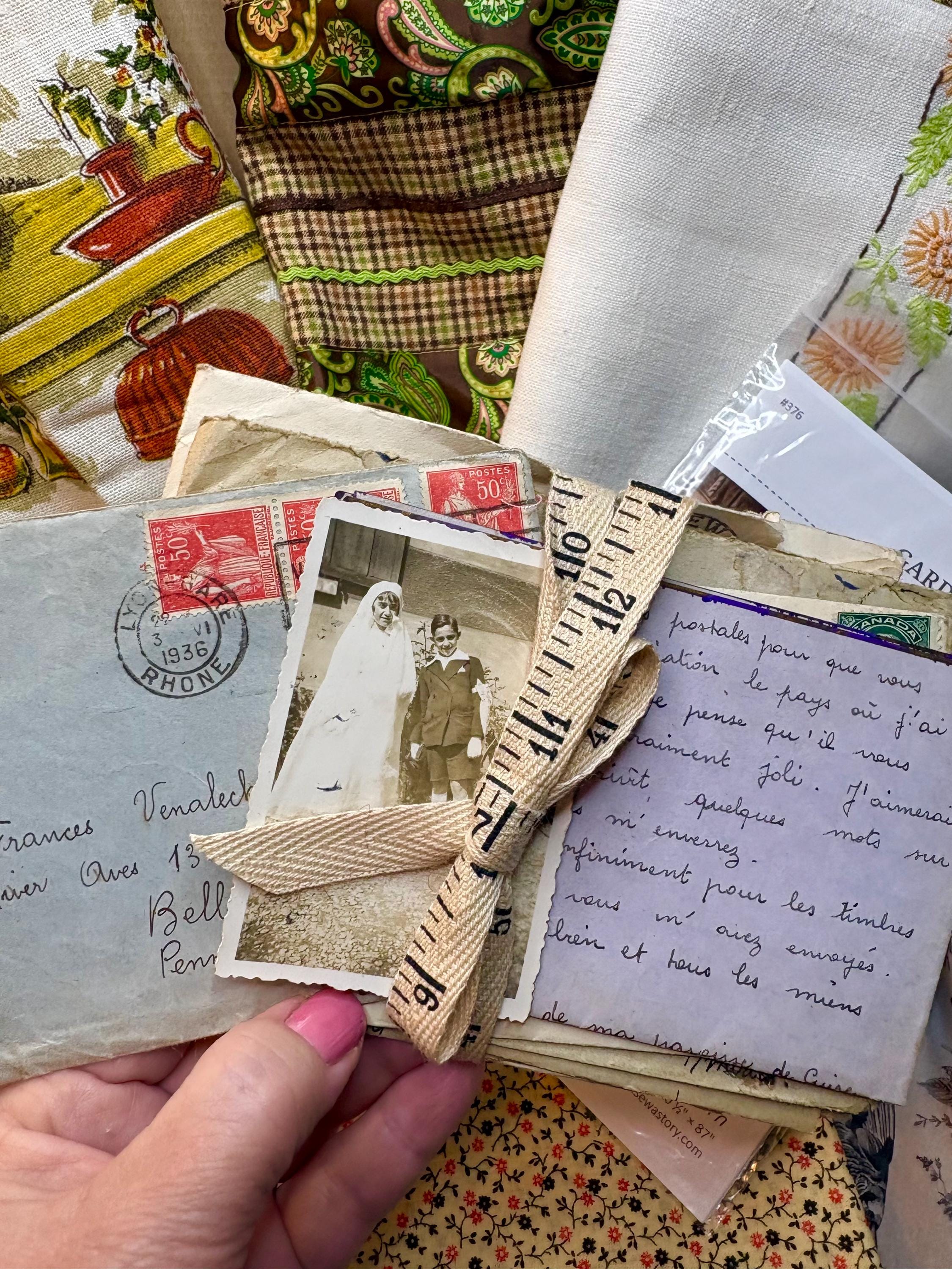 9. One collection of antique letters from the 1930s between two girls, one in the US and one in France. They were pen pals. There is a photo of the girl from France included in this collection. We've tied up the letters just as one of the girls might do to keep them together.