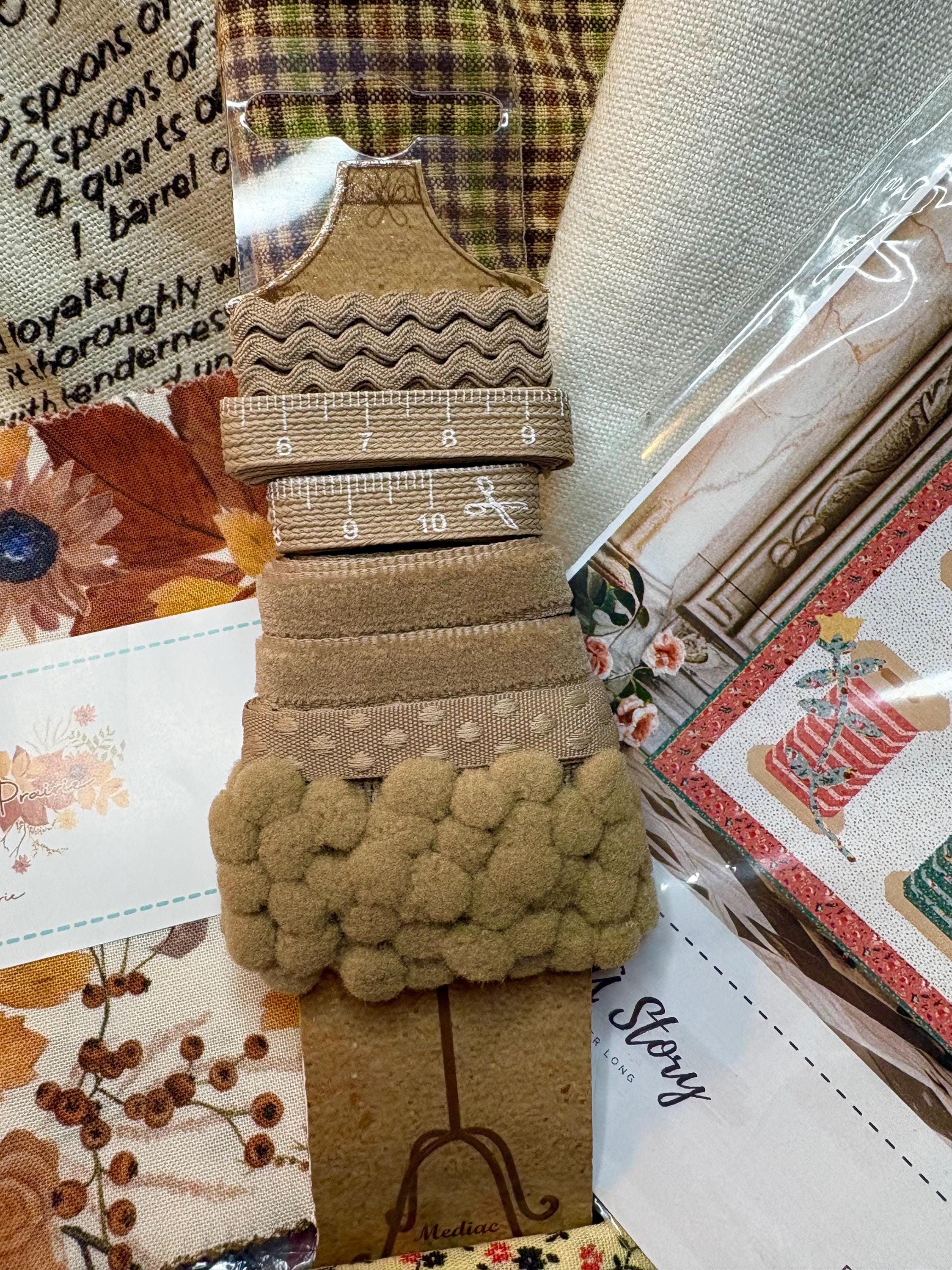 8. Set of trims in Taupe to match the charm pack. Set includes 5 Retro Trims Velvet, Ric Rack, Pom Pom, Printed Measuring Tape. You get one yard of each type for a total of 5 yards of trim.