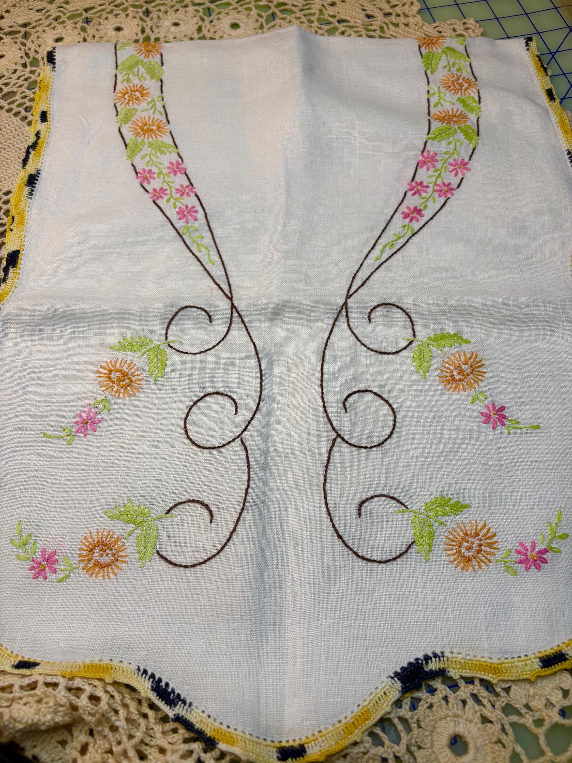 7. One long Vintage Embroidered Floral Runner. Measures 37" long. Linen and beautiful.