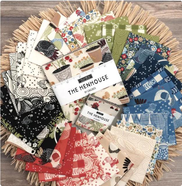 Let's go to gather eggs in The Henhouse. This charming line from Moda Fabrics shows adorable Hens/Chickens, picnic check gingham with flowers, garden florals, little chicken footprints and more.