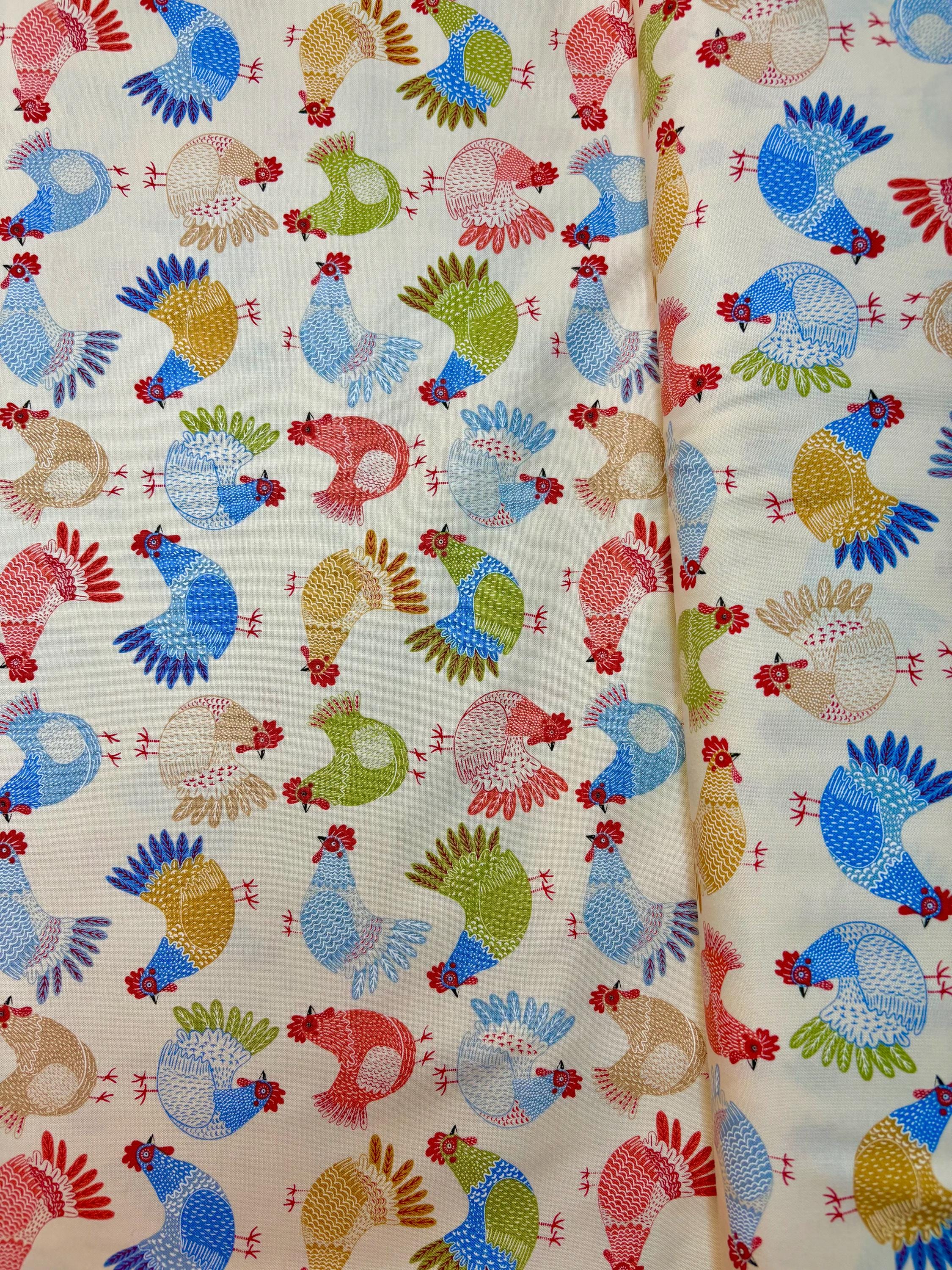 Let's go to gather eggs in The Henhouse. This charming line from Moda Fabrics shows adorable Hens/Chickens. On this print from the line, there are multi-colored hens on a cream background.
