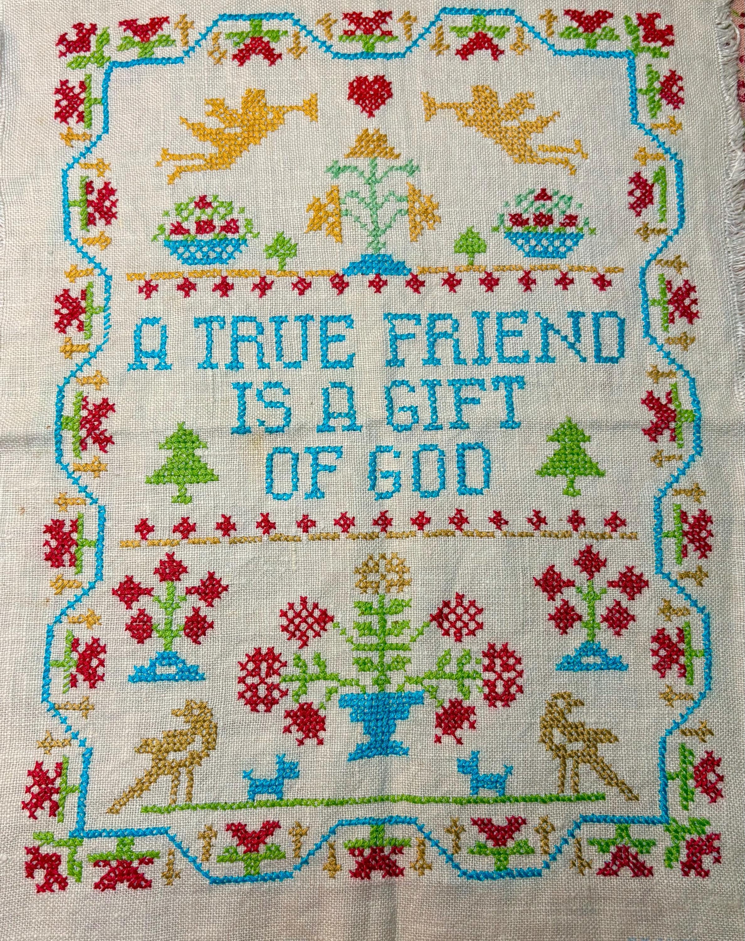 This lovely Sampler is vintage. It was executed in crosstitch with great colors of aqua, red, gold, and green. Excellent stitching skills. This might look lovely as a pillow or framed. Linen.