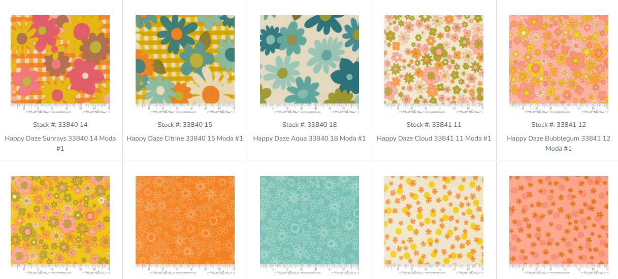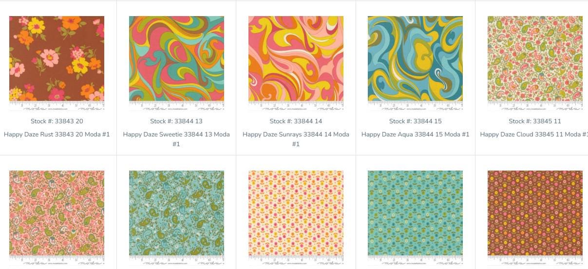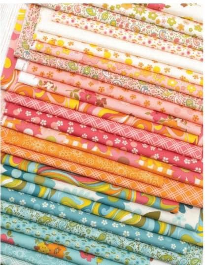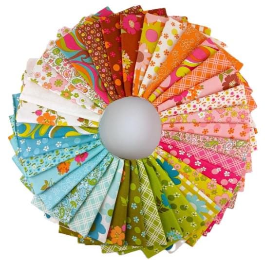 This CHARM PACK from Moda harkens back to the 60s and 70s with some groovy colors and patterns. There are florals, plaids, swirls, big polka dots and more. The colors will remind you of these eras with avocado green, ochre, orange, pinks, aqua, etc. Turn back the clock with this fabulously groovy pack.