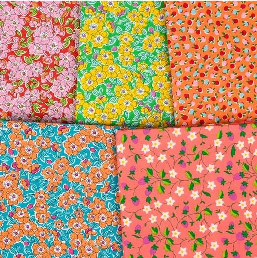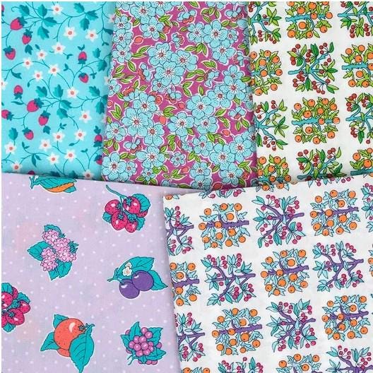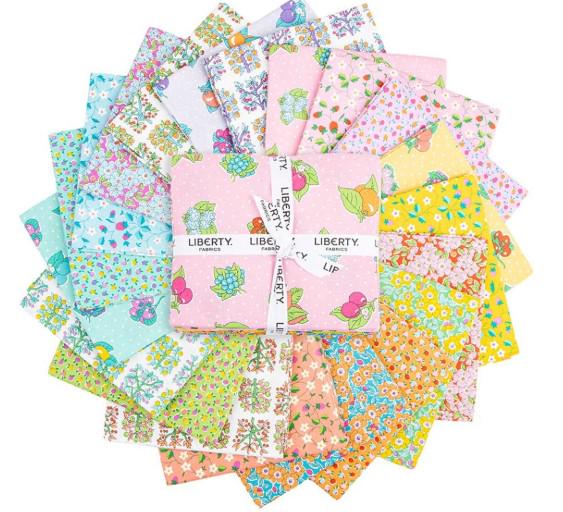 These Italian prints from Liberty of Italy bring the essence of gardens and orchards in their famous Lasenby Cotton for quilting. Lasenby Cotton is an exclusive weave of Liberty Fabrics which gives these fabrics sturdiness and strength to last generations. This fat quarter bundle has orchards of fruit, growing on vines, oranges, strawberries, grapes, cherries, lots of florals, large and small fruits and more. There are superb colors and color combinations.