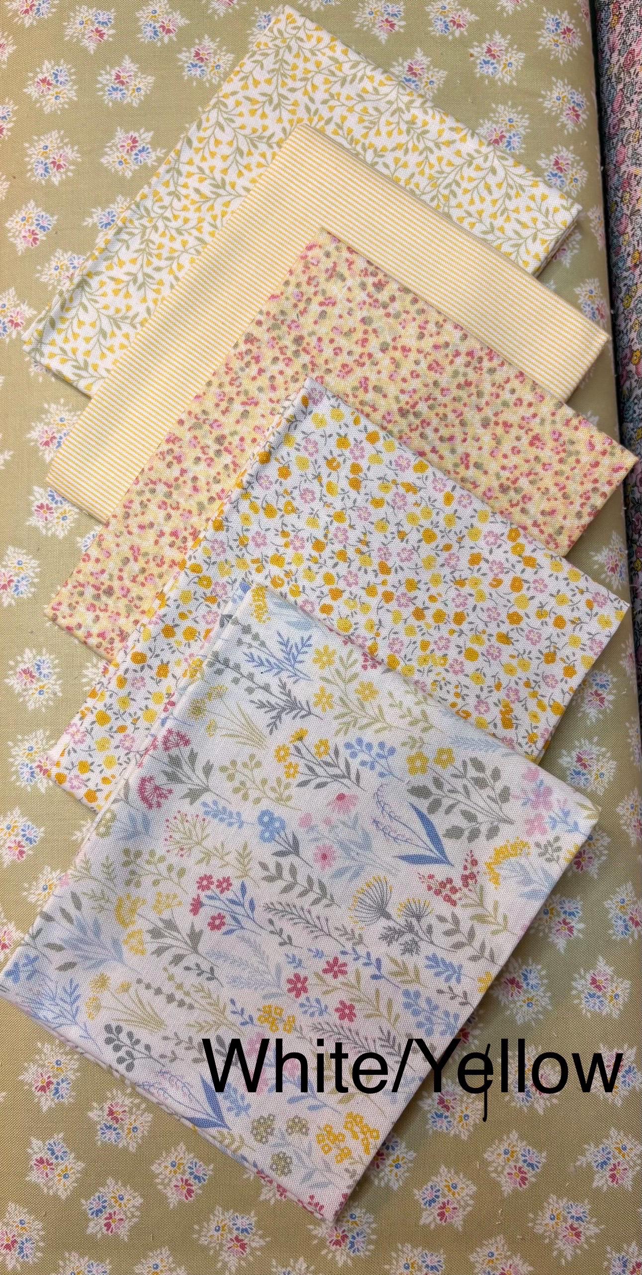 1. White and Yellow fat quarter bundle has 5 fat quarters and includes small to medium florals and even a stripe.