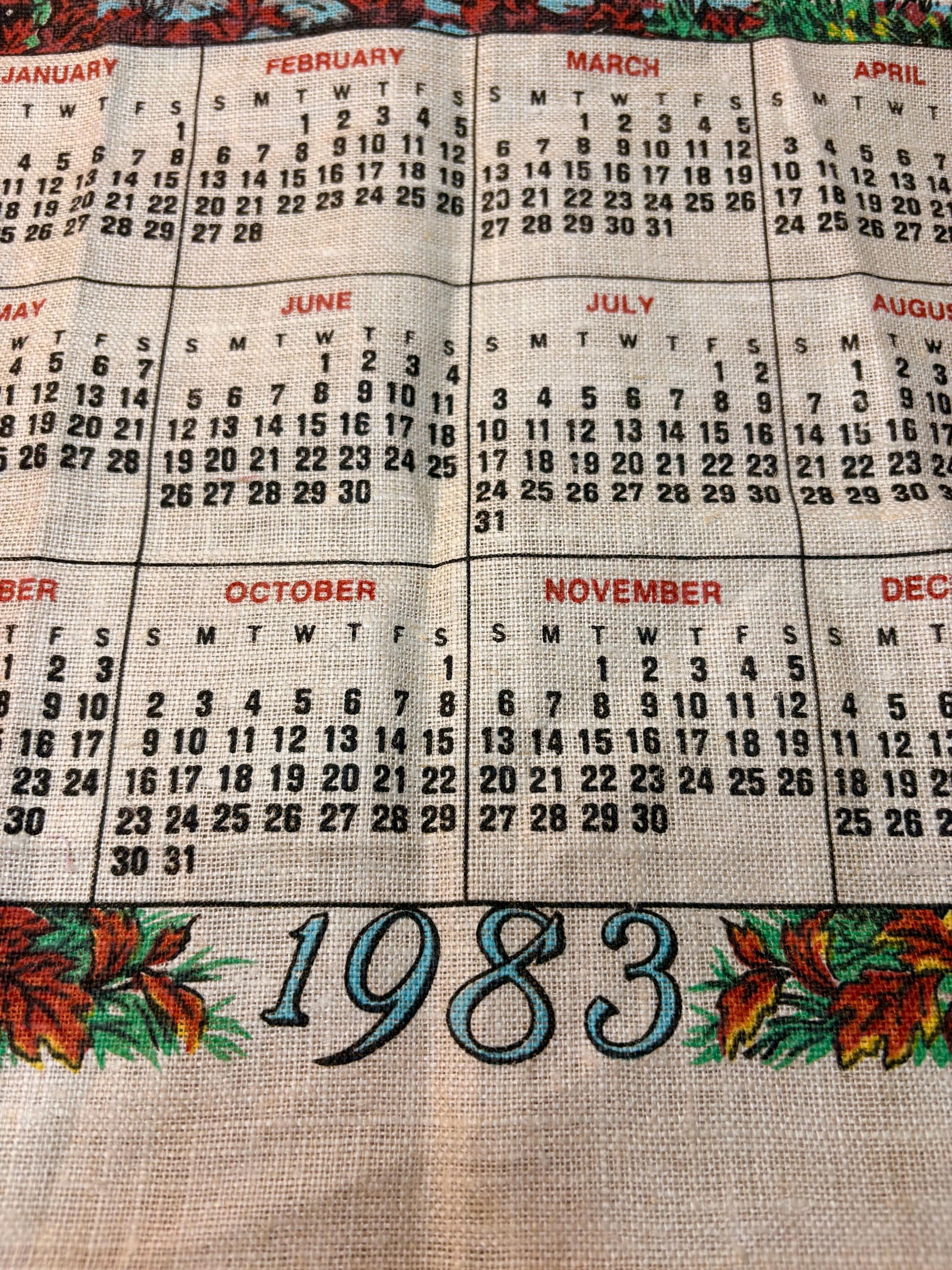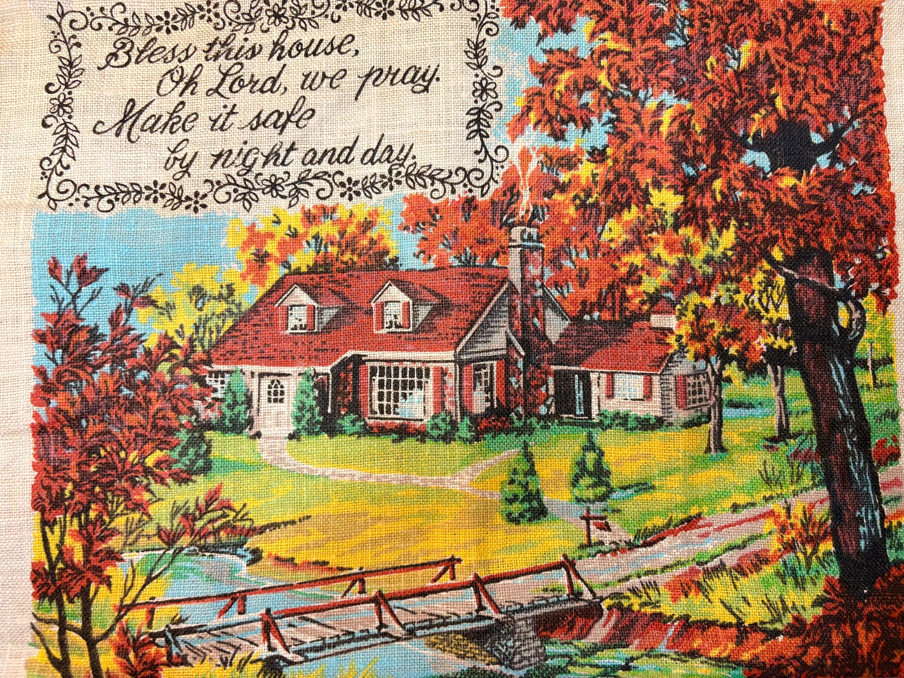 This vintage calendar towel is from 1983. This fabulous autumn scene shows a cottage surrounded by oranges, and golds from the leaves changing. My favorite part about this scene is the stream that runs in front of the cottage and there is a bridge that goes over it. Oh, to live here. Calendar says, "Bless this house, Oh Lord, We pray Make it safe by night and day." Colors are orange, gold, green and blue.
