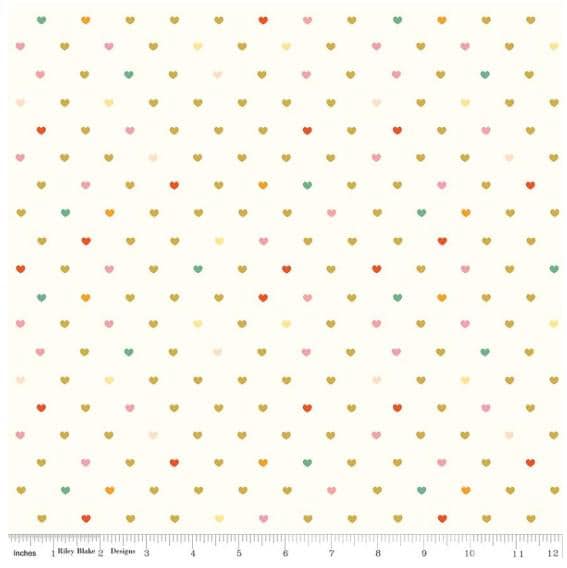 This adorable fabric line is called Serendipity 2 and is by designer Minki Kim. Her stuff is always so cute. This particular print shows tiny multi-colored hearts on white. There are red, pink, yellow, teal and mustard colored hearts.