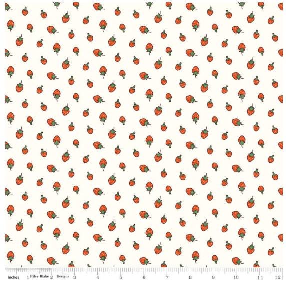 This adorable fabric line is called Serendipity 2 and is by designer Minki Kim. Her stuff is always so cute. This particular print shows little strawberries on a white background. I also have this in a pink background and a blue/green background while supplies last.