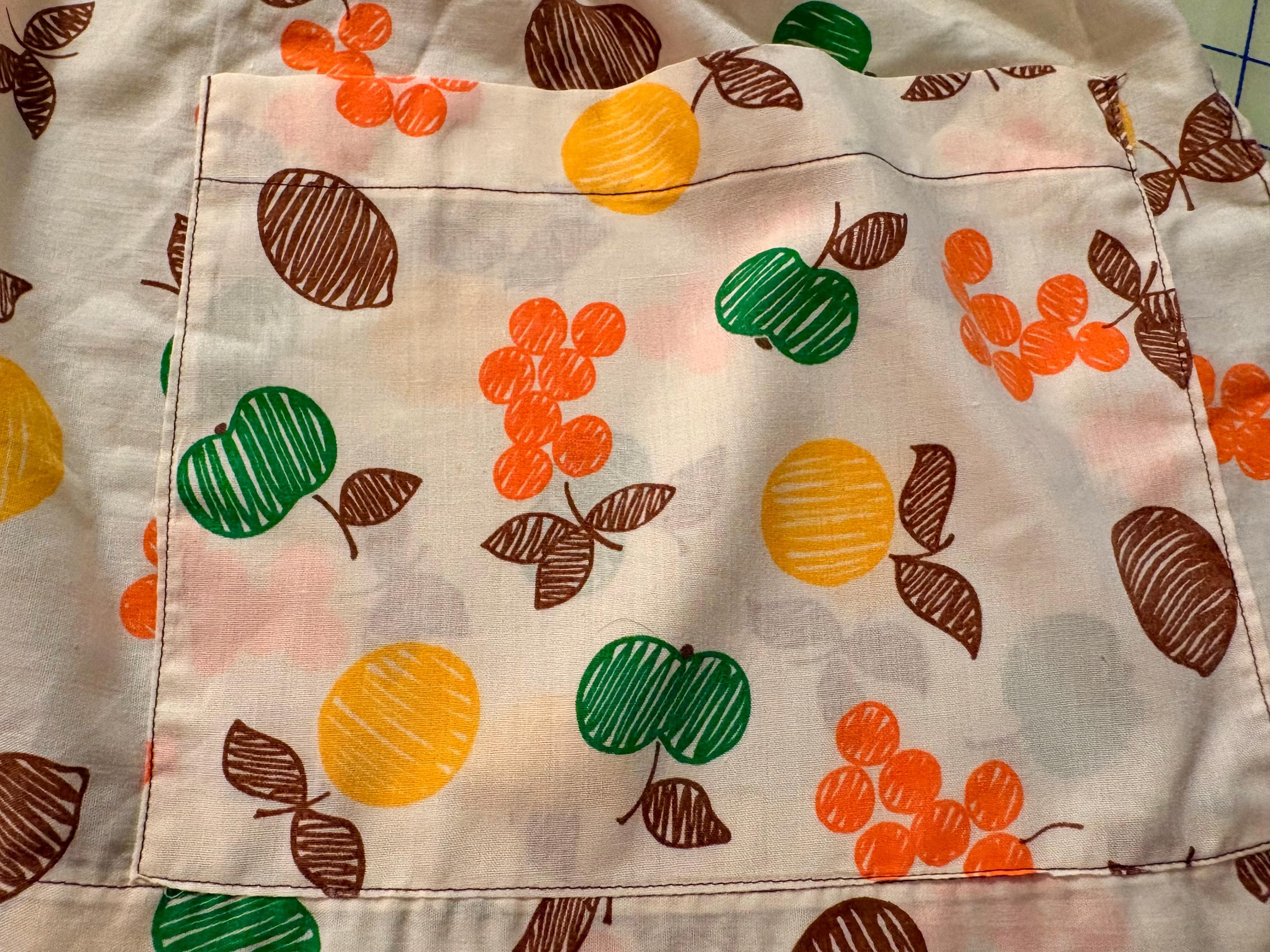 This precious PLUS SIZE VINTAGE Half Apron was all the rage back in the day. The apron shows fun large pieces of fruit. It shows lemons, grapes, apples and more. I would date this item to the 1960s. The fabric is absolutely fabulous. The fruit measures about 1.5" or more wide by about 3" tall or less. There are two pockets, and the apron ties in the back.