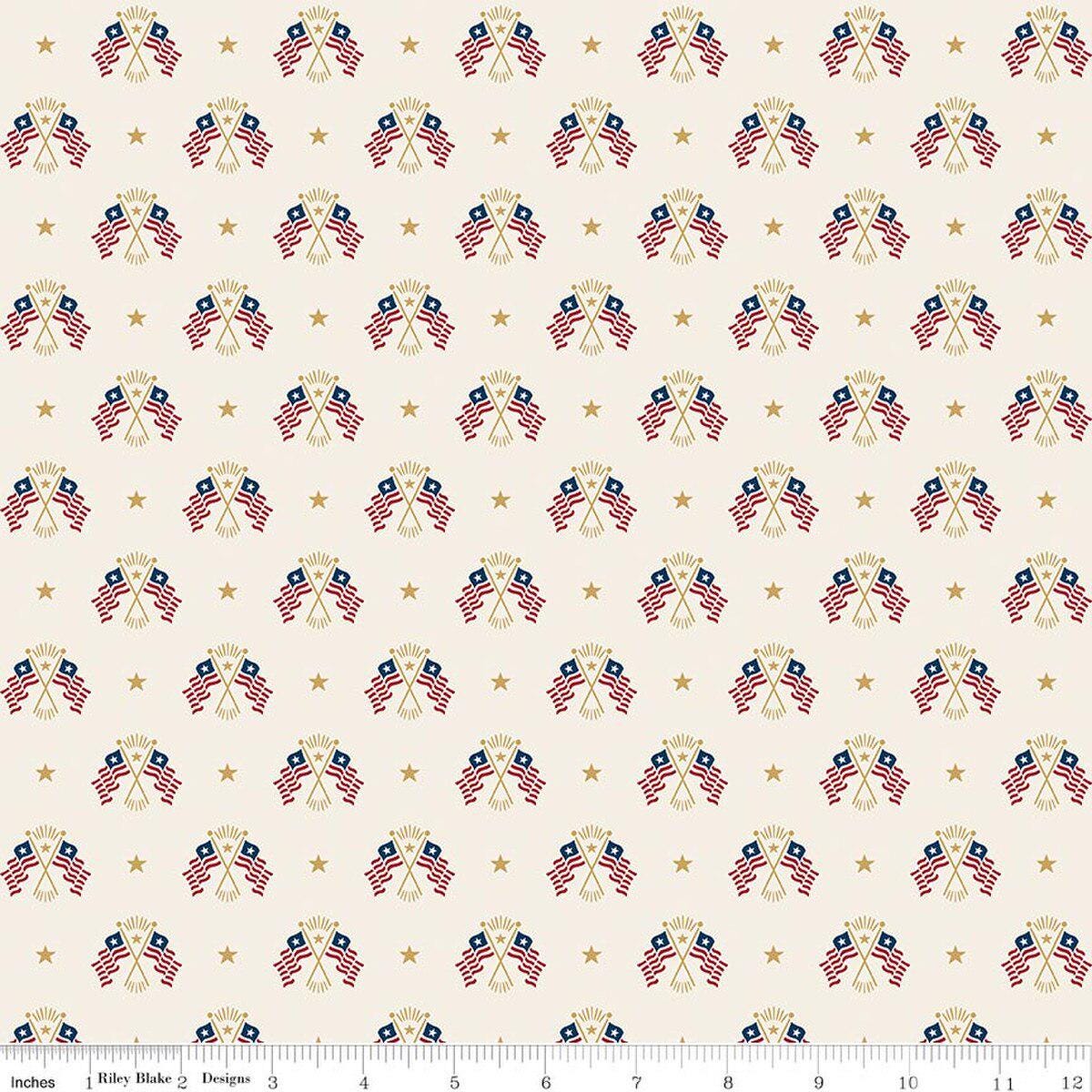 There is no better year than this year to celebrate our nation's 250th birthday. If ever there was a time to quilt/sew or craft something, now is the time. This particular fabric is from the Independence/Celebrating 250 years line. It shows double flags crossing one another. Backgroud is cream.