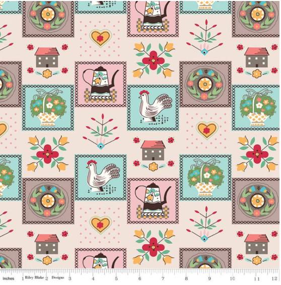 This harkens back to the 1950s and is the perfect kitchen fabric. This shows roosters, coffee pots, cottages, flower baskets and more. Darling vintage style colors as well.
