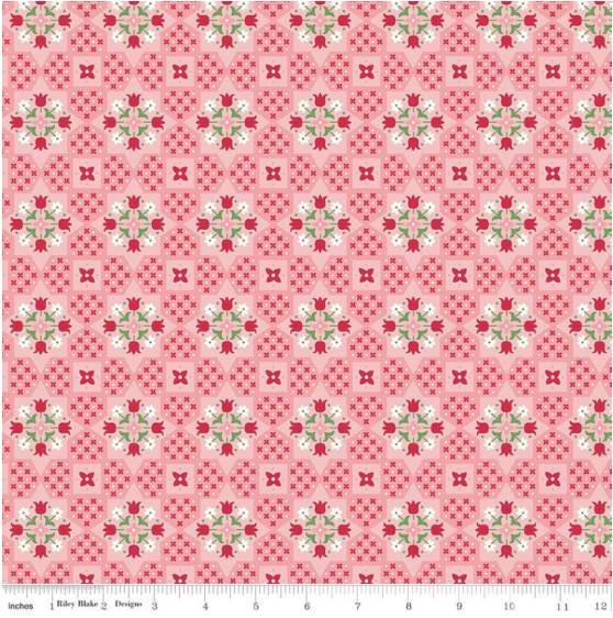This harkens back to the 1950s and is the perfect kitchen fabric. This shows diamond shapes with tulips on each point. Very Pennslyvania Dutch looking. This very unusual design pairs perfectly with our Flea Market Kitchen fabric or any Lori Holt fabric which we carry a large selection in our shop.