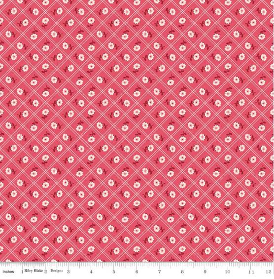 This line is called Berry & Sage by Lori Holt. It only uses two colors red and green in various hues and the results are amazing. This print features a thin, double striped lattice filled with a single flower.