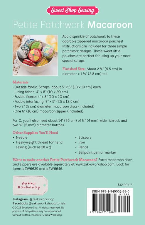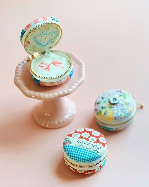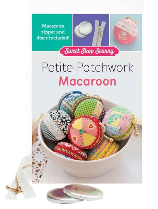Kit includes: pattern, two 2" discs that form each side of the macaroon. Also included is the zipper with ball on the end. This is a scrap friendly project.