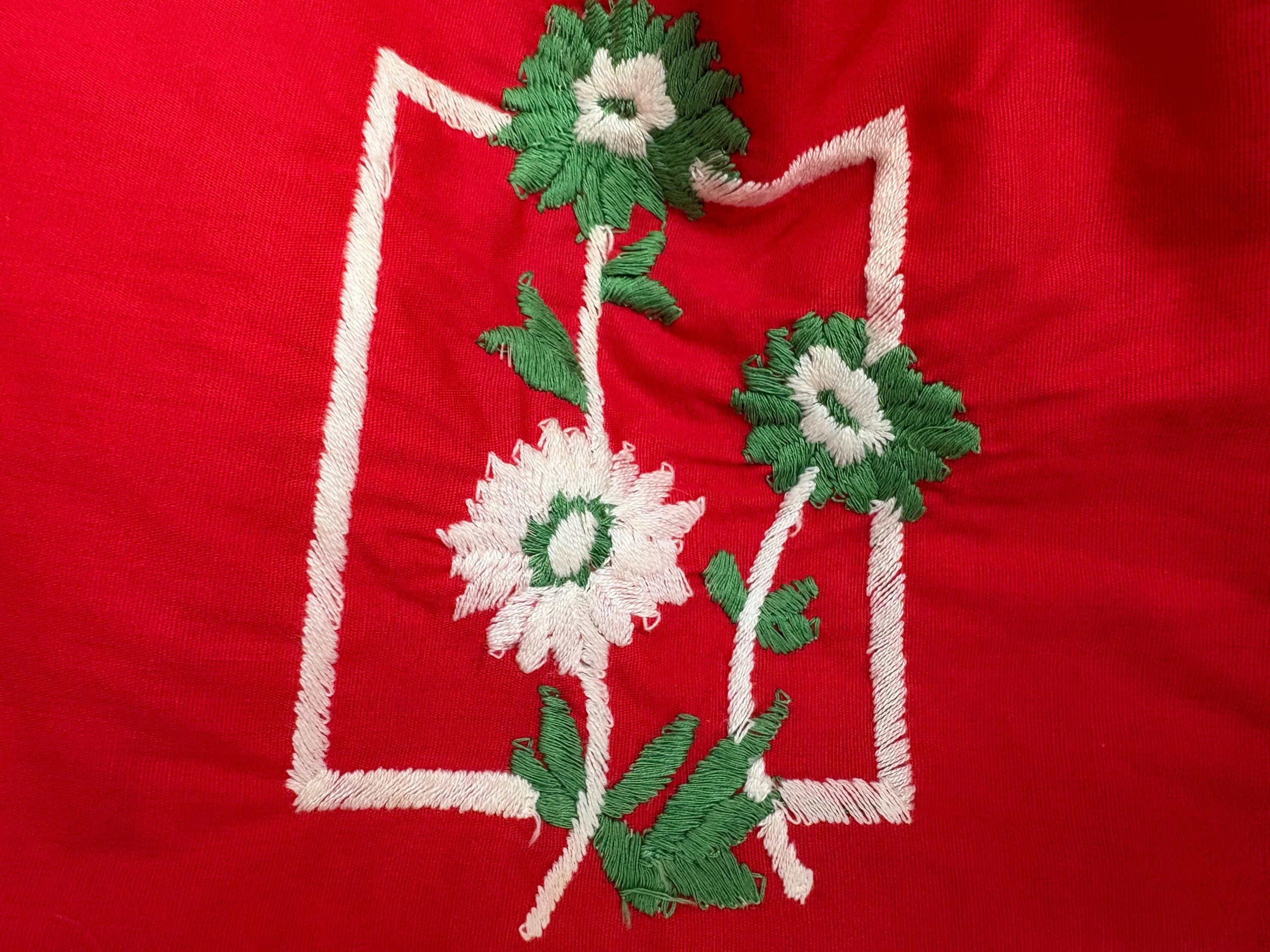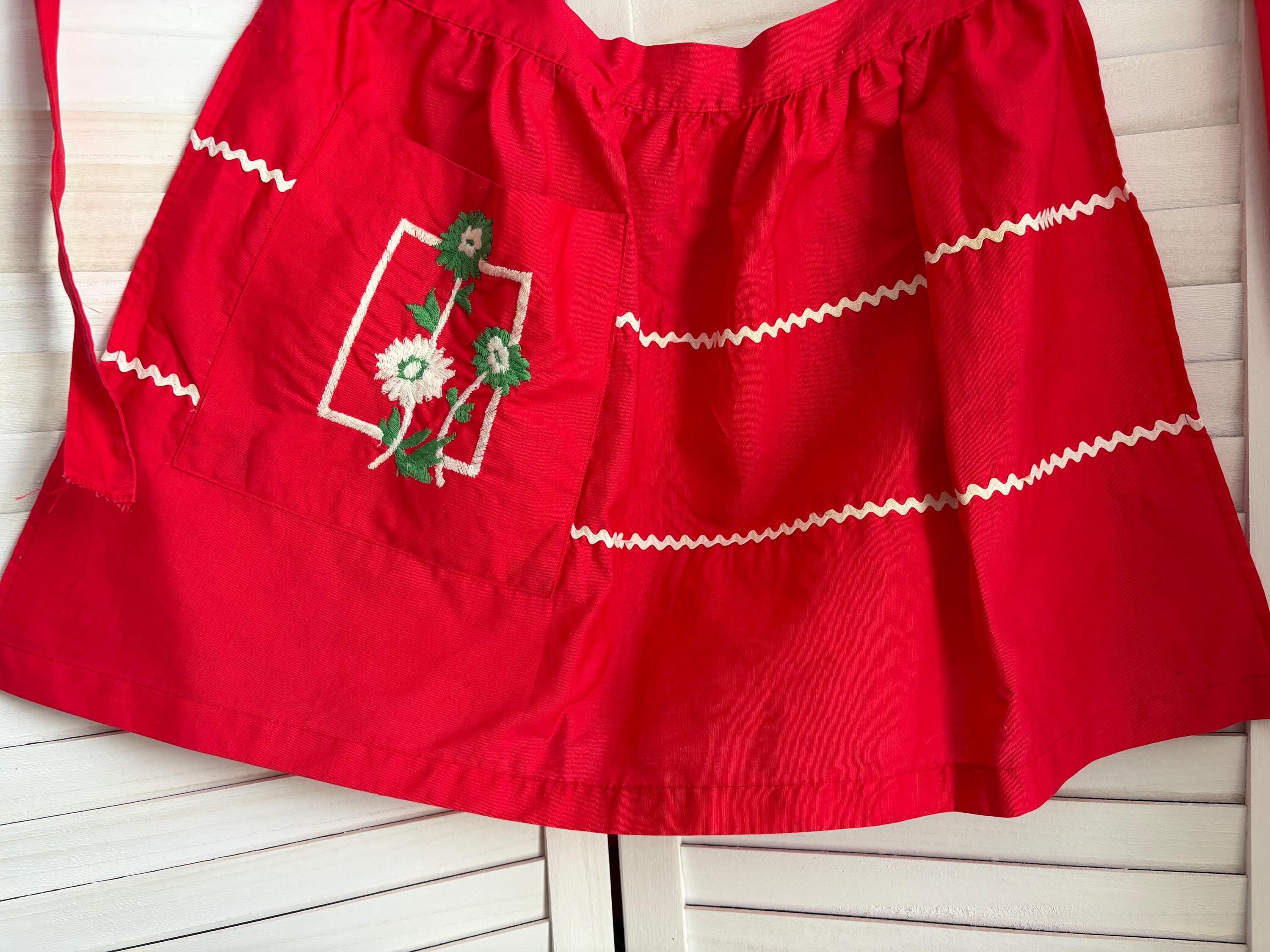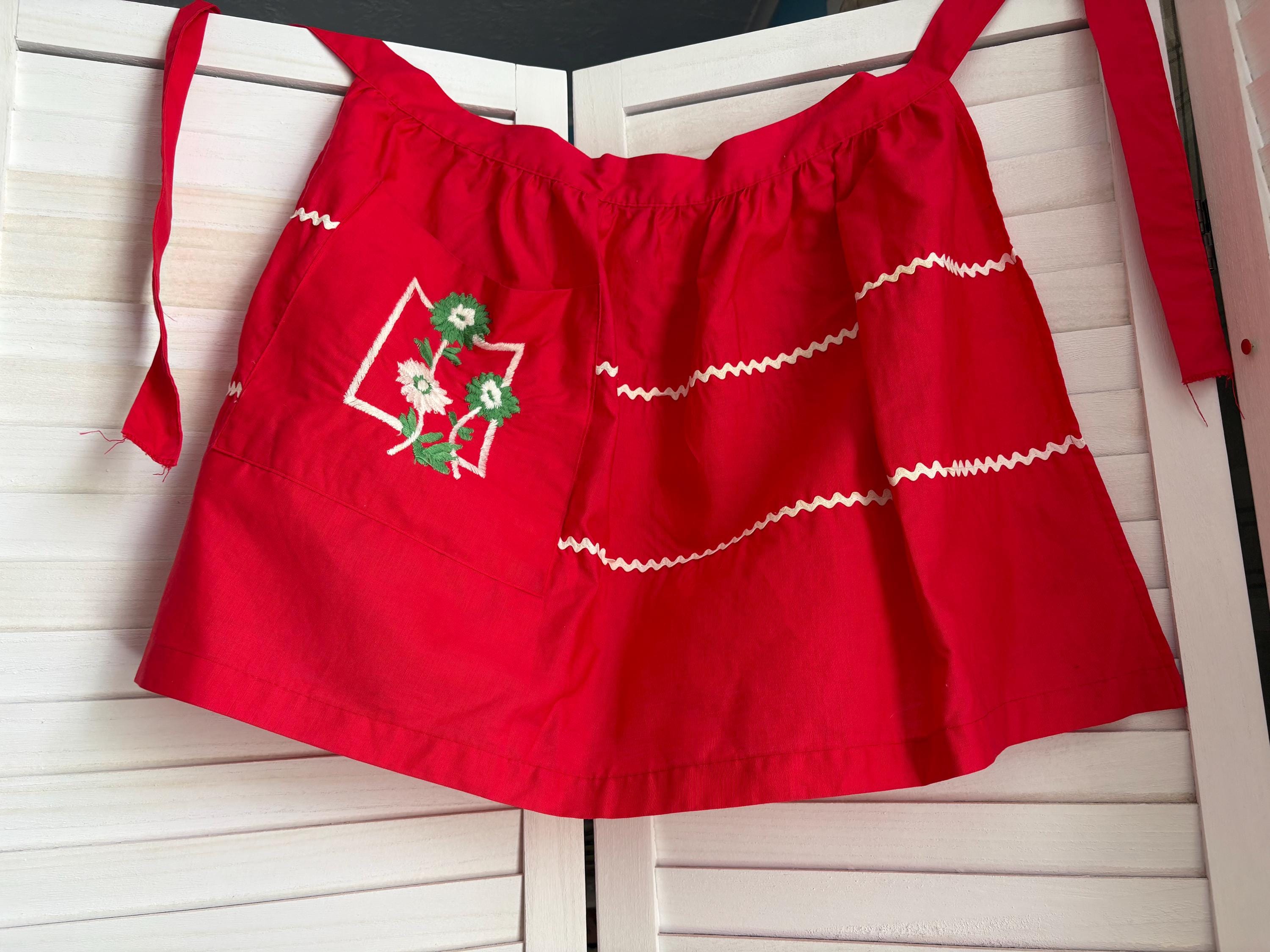 This precious Red Floral Half Apron was all the rage back in the day. This was handmade and machine embroidered. Apron has a handy pocket that is adorned with white and green flowers. There is also white rick rack across the upper and lower parts of the apron.