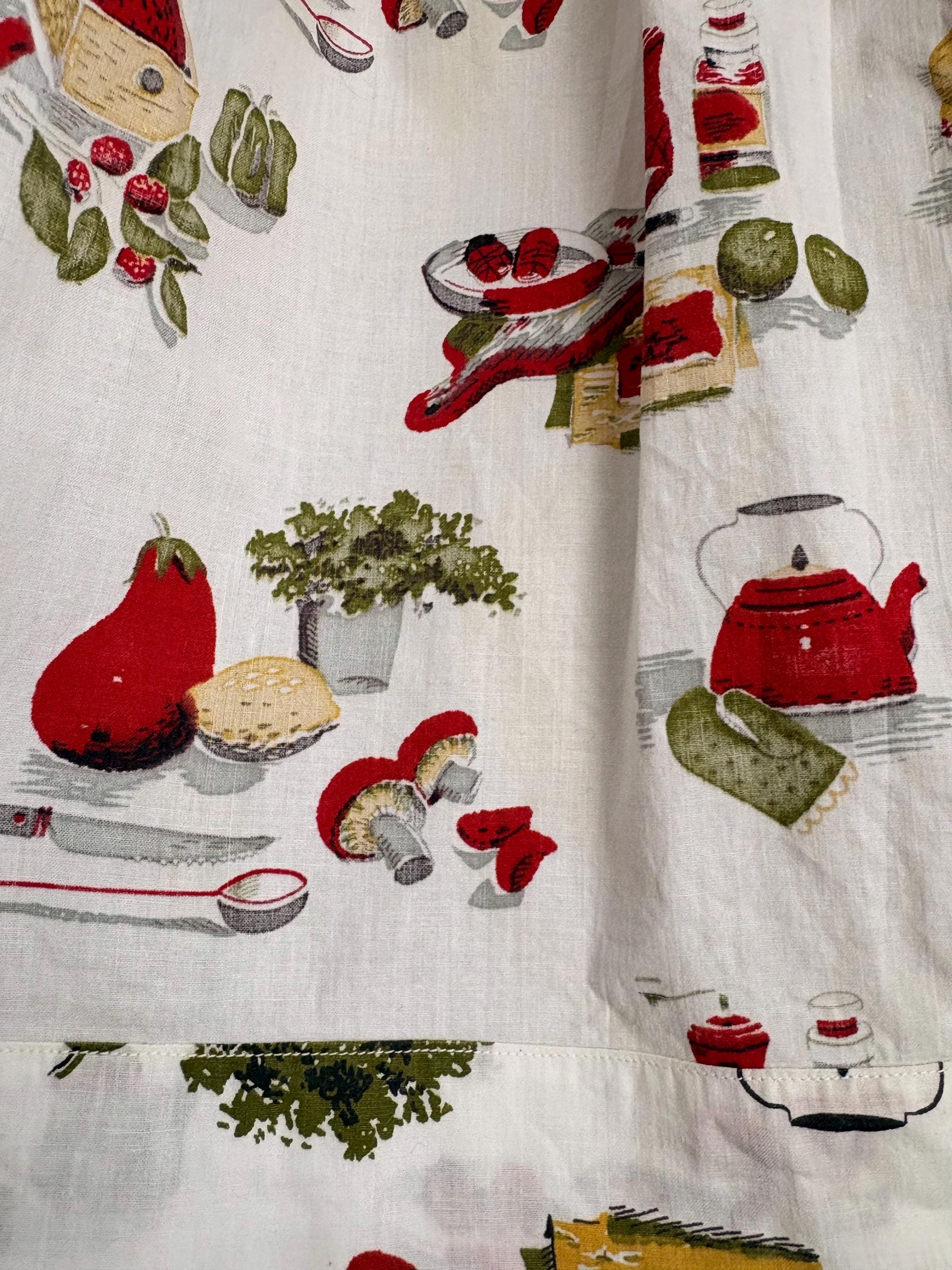 This lovely PLUS SIZE white kitchen half apron shows a darling 50s/60s print that shows a red tea kittle, vegetables, pots ladle, mushrooms, potted herbs, spices, potholder, frying pan, more. These are great vintage images. Apron ties in the back. It is very hard to find these plus size aprons.