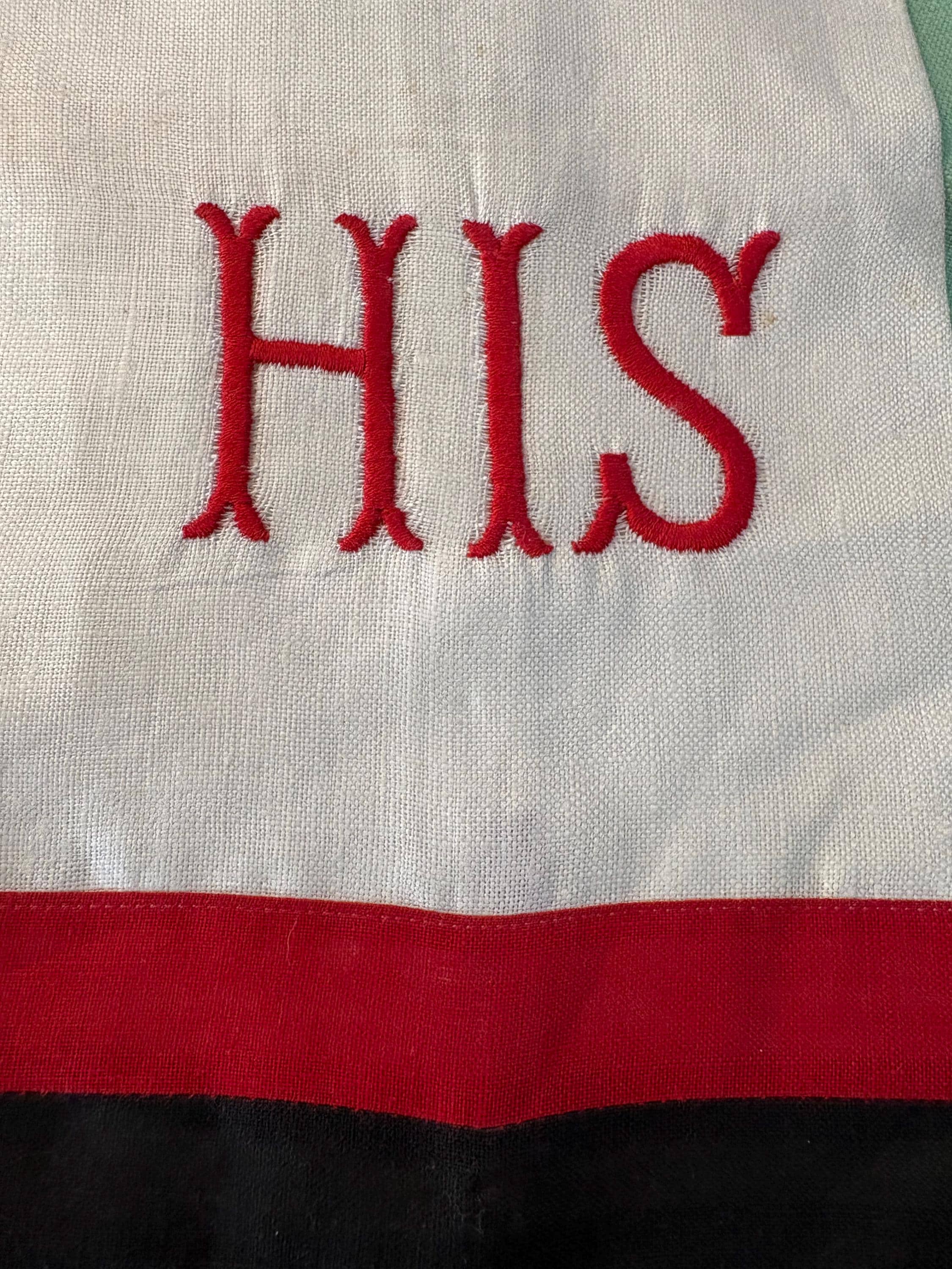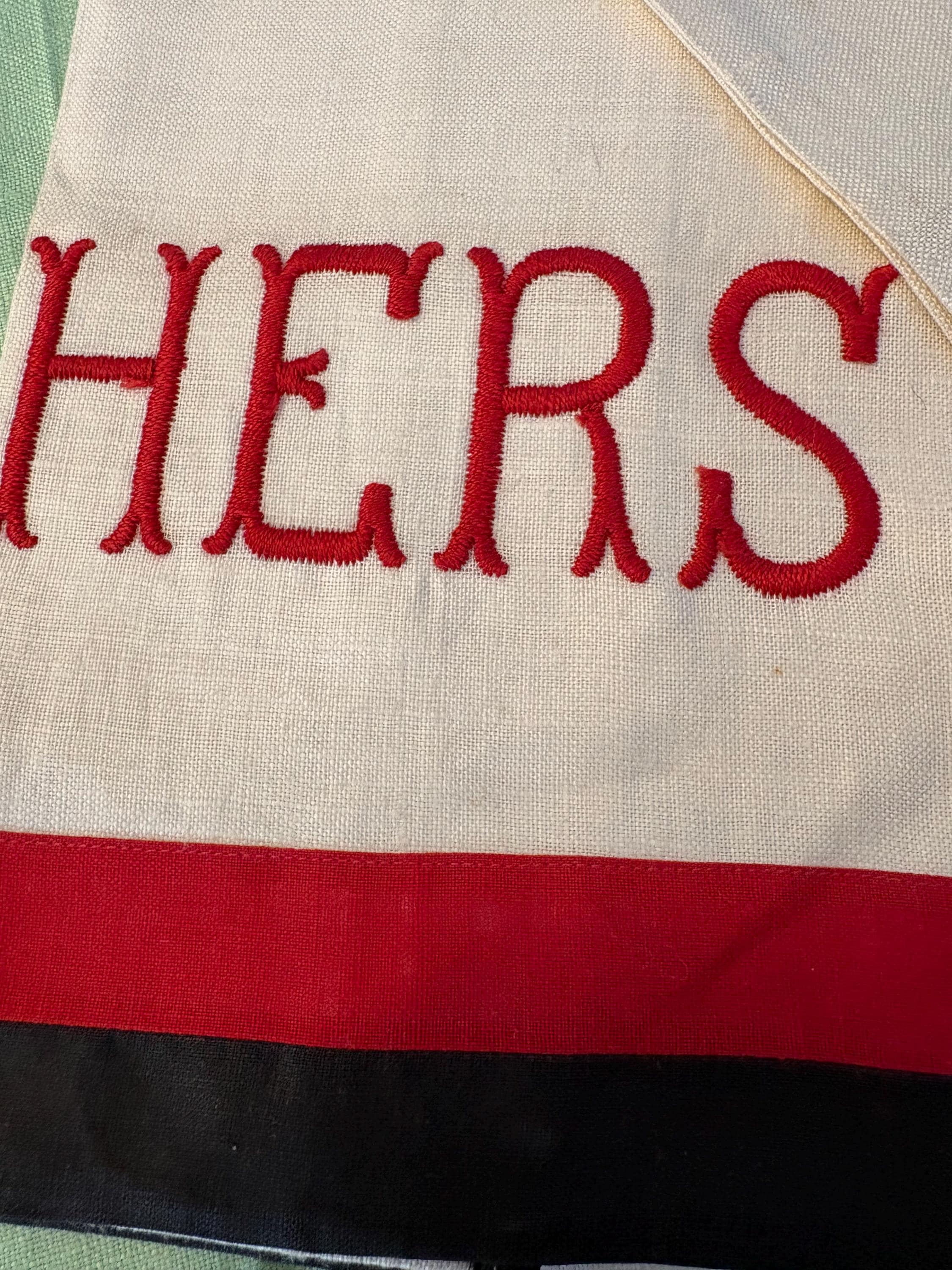 This is a set of Vintage Linen towels. The color scheme of red and black are iconic Art Deco style which would date this to the late 30s if I had to guess. You get two towels, one says: His and one says: Hers. There are bands of red and black below the words. These towels are linen, handmade and machine embroidered.