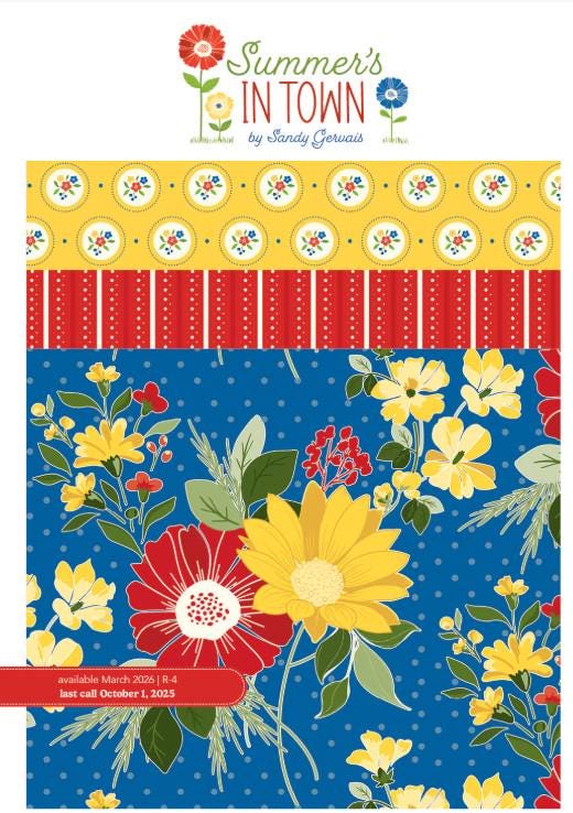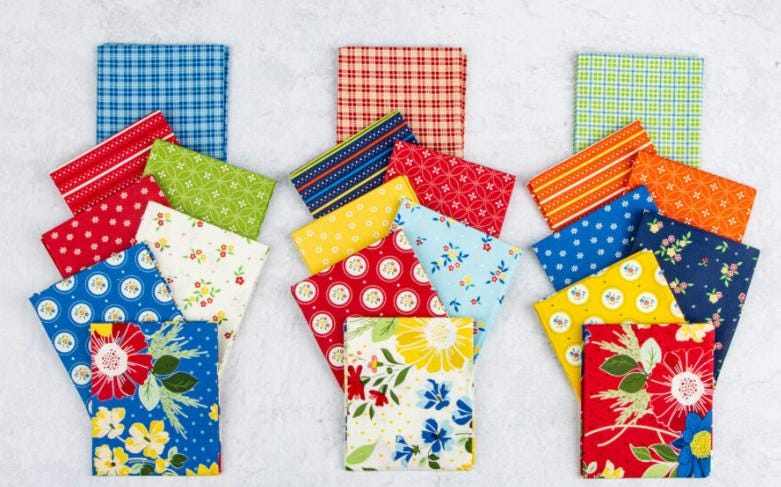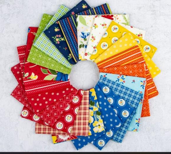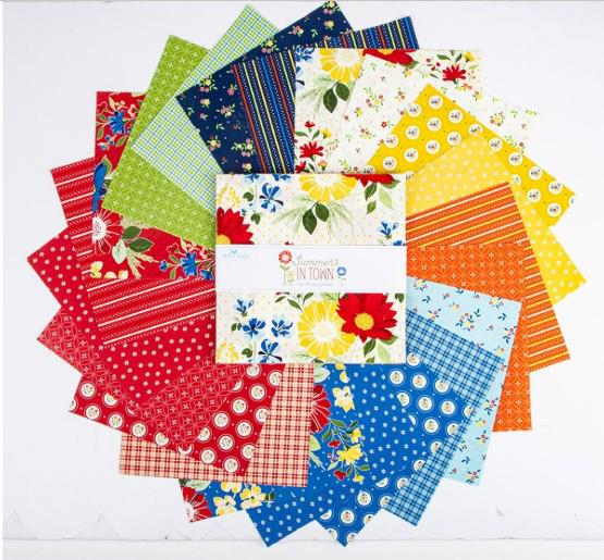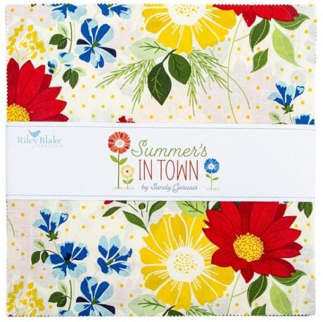 This line is called Summer's in Town by Sandy Gervais for Riley Blake. This charm pack will get you in the mood for warmer days, showy flowers, and all of the colors of summer. There are florals, checks, stripes, and more.