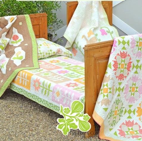 Photos 9 and 10 show some of the quilts created with this line. We have the Gertrude Goose quilt and the Maisy Daisy quilt in stock now that were created from this line.