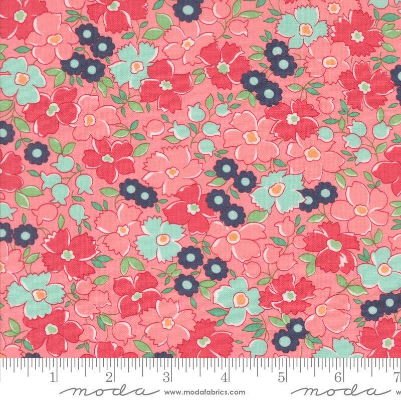 Let's go to summer where the living is slow, and the sights and smells are relaxing. This line called Summertime by Moda will give you all of this and more. This particular print is a darling vintage inspired floral print. These color combinations are gorgeous. There is a navy, light blue and a coral. Love it.