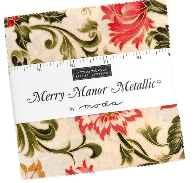 In this charm pack, you will find poinsettias of red and white, pinecones, holly berries and greenery, golden swirls and more. Colorways include cream, crimson, evergreen and ebony black.