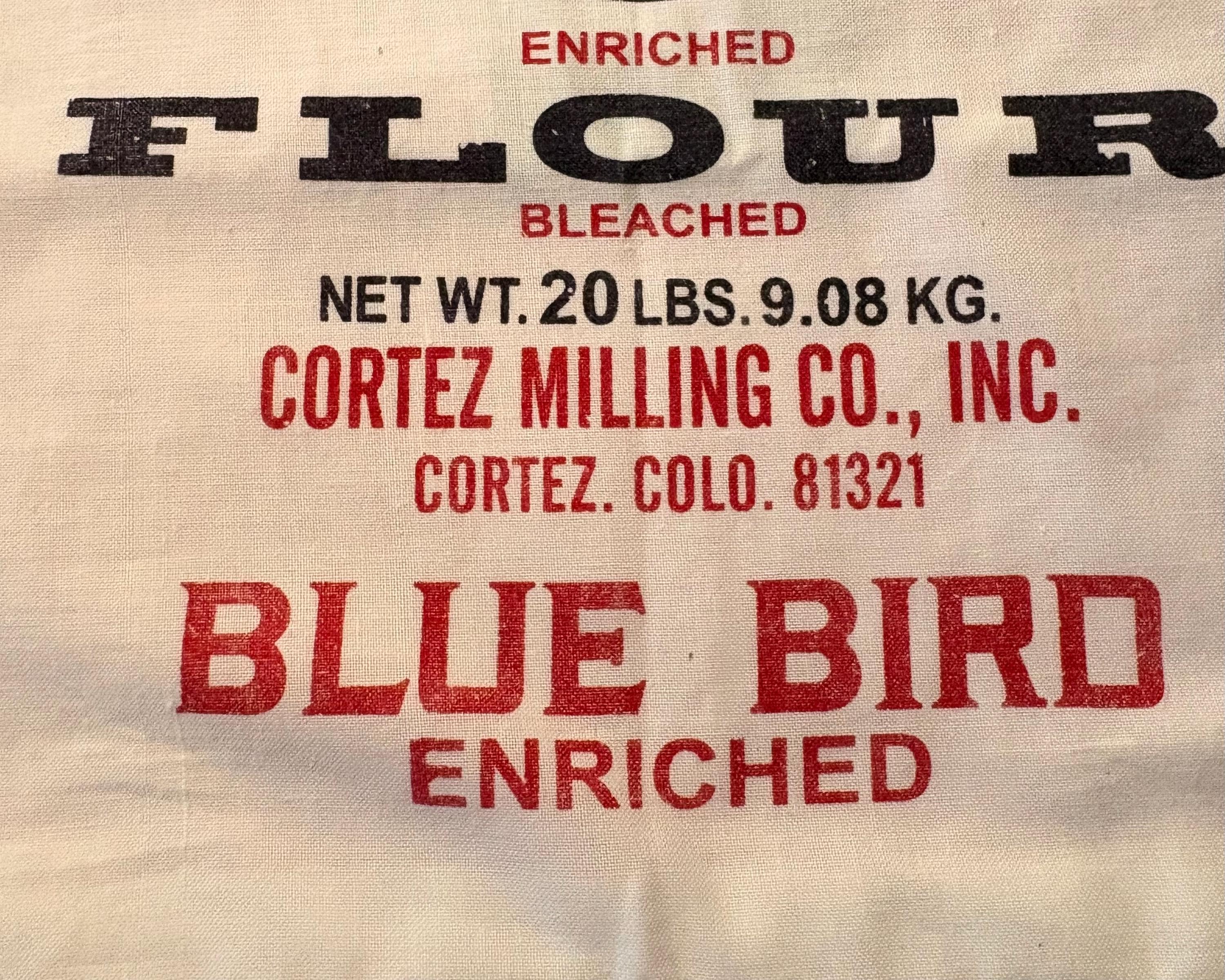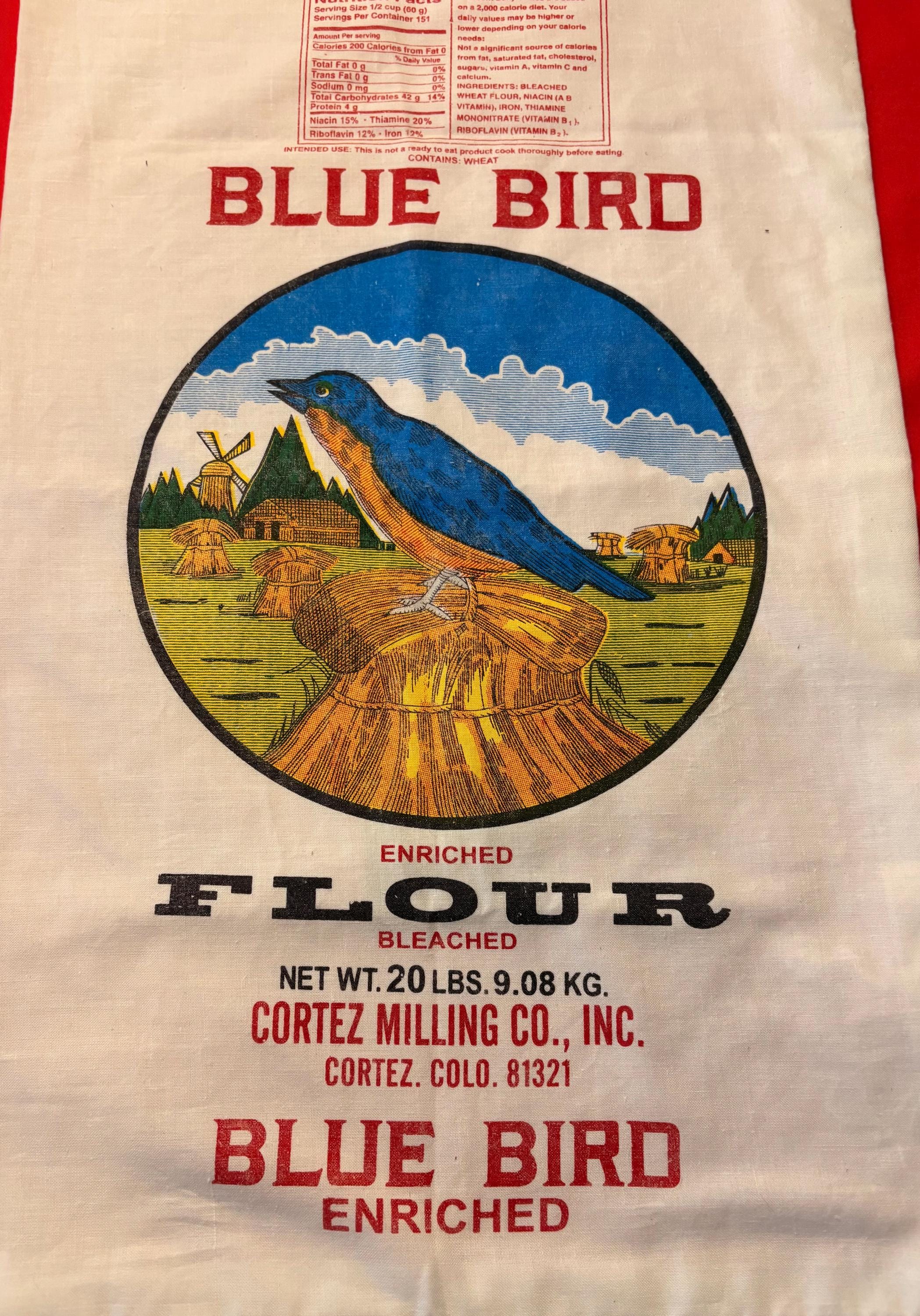 This bag is the Blue Bird Enriched Flour Unbleached. It has great vintage art to make this into a bag to carry which would be easy as it is already a bag. On the front it has the artwork and nutritional facts. On the back, it does have a UPC code toward the bottom of the bag. The code is printed on, but you could sew it to where you exclude this part. Fabric is very soft. It is classic flour sack material.