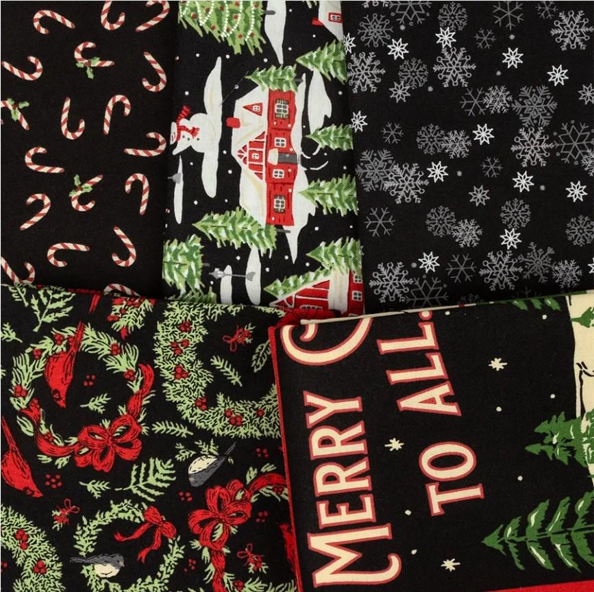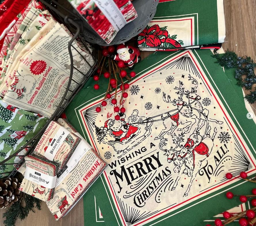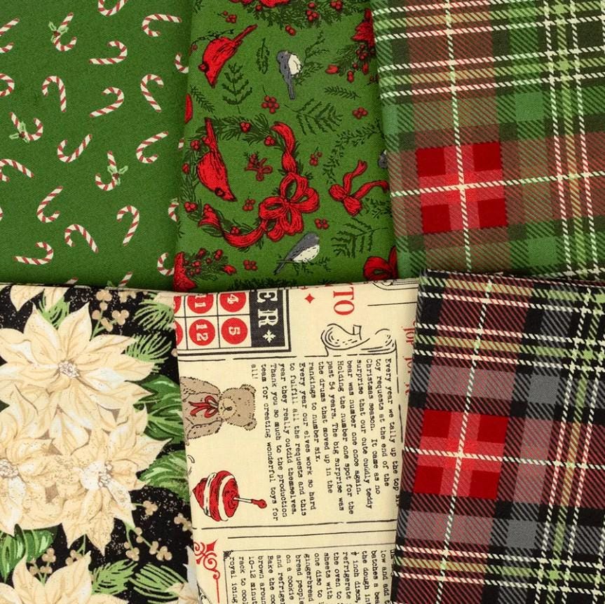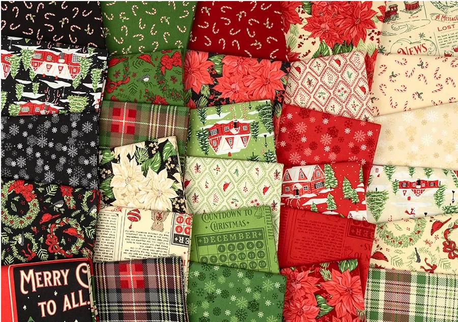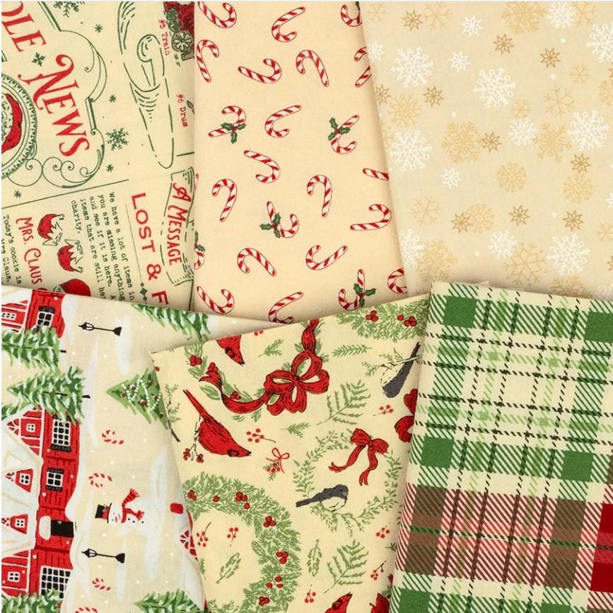 If you love vintage, you will love this FAT QUARTER BUNDLE. This has everything for a Very Vintage Christmas. The name of this fabric line is Holiday Cheer, and boy will this make your festivities cheerful. This line incorporates a vintage style newspaper on the fabric with all kinds of articles about Christmas, Santa, a recipe and more. There is also poinsettias, snowmen, snow covered cottages, cardinals, candy canes, plaids, Christmas wreaths, Christmas trees, snowflakes, holly, mistletoe, and much more. Get your Christmas spirit started with one of our favorite lines of the year.
