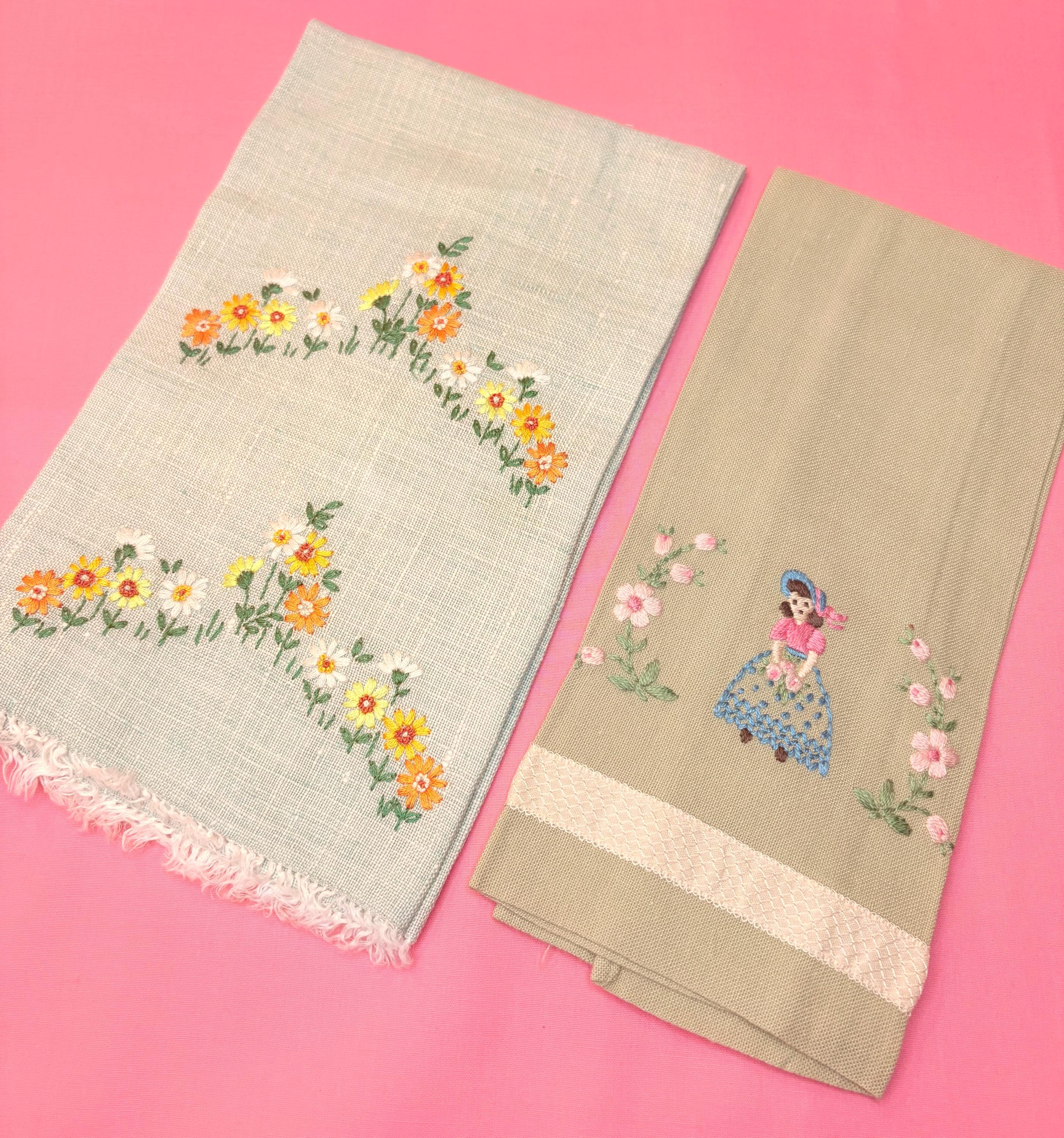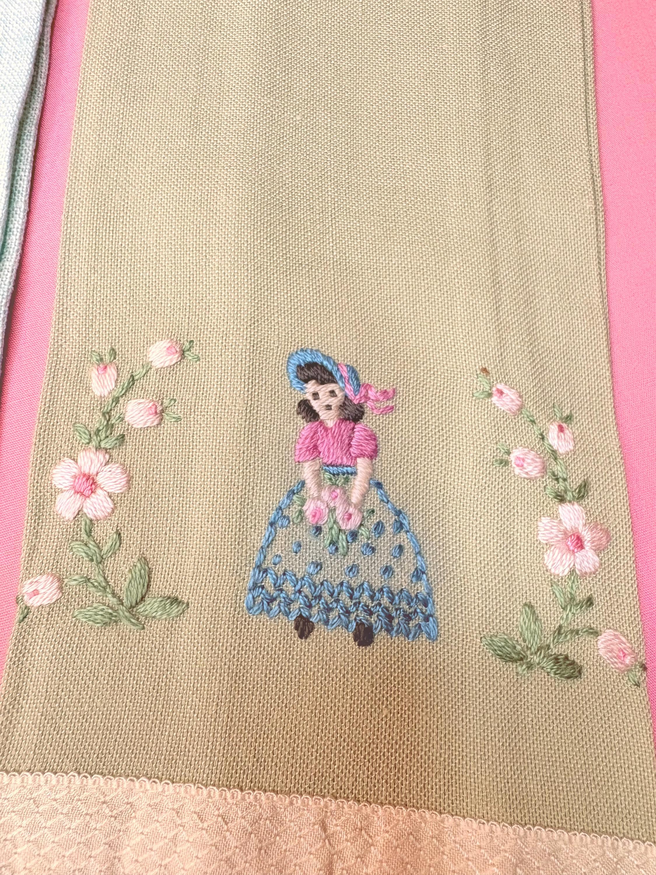 This is a set of Vintage Linen Embroidered finger tip towels. Each is different, but they go so well together. The first towel is the larger one. It is a woven mint green with fields of embroidered flowers in yellow, white and orange. It is so pretty. The second towel shows an embroidered lady with a bonnet and a purse surrounded by embroidered flowers. Although these greens are different, they compliment each other. Both are wonderful old timey greens.