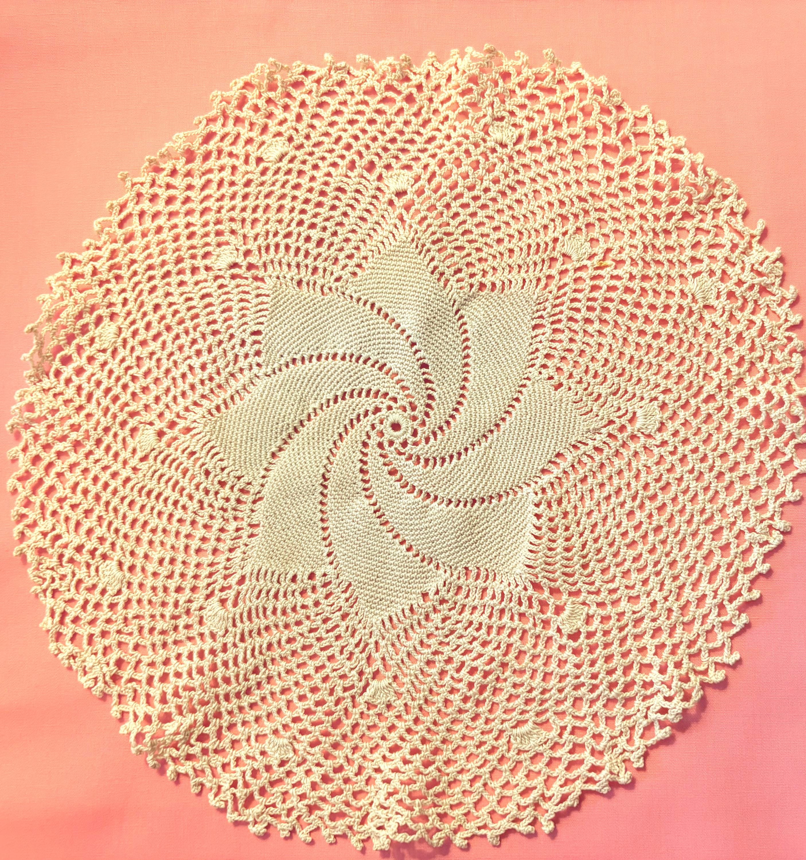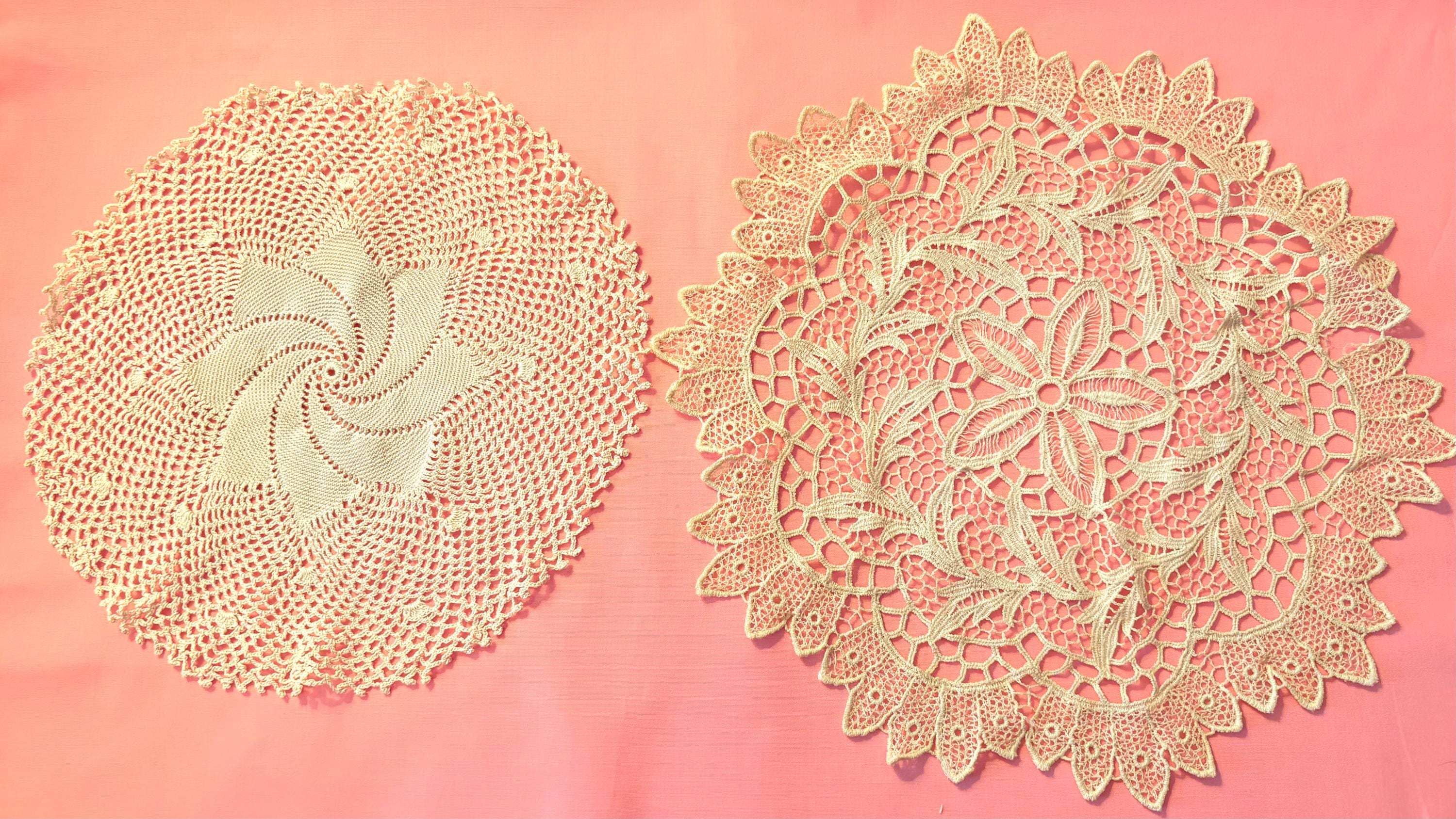 This is a set of Vintage Ecru Crochet and Lace Doilies. Both are different, but similar in color. The first one is a medium sized floral Battenburg lace round doily with a flower in the middle. The second one is also a medium sized crochet doily with intricate stitches and a swirled star in the middle.