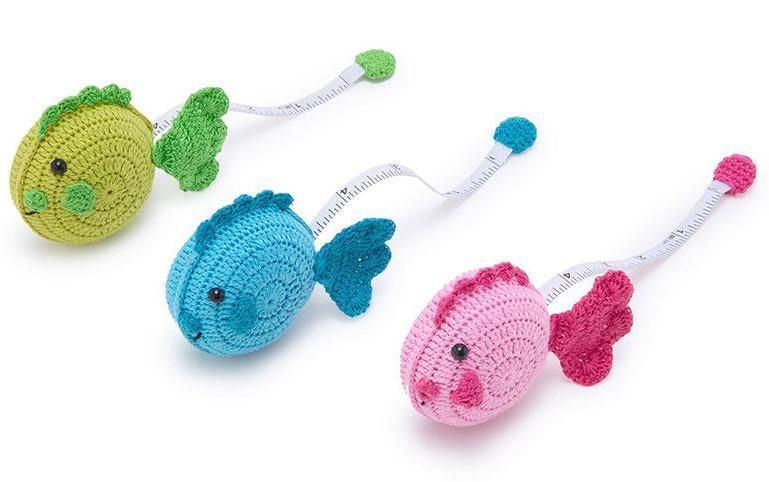 This adorable FISH TAPE MEASURE is a crochet dream. He/She is so adorable. Keep him handy by your sewing machine. Need to measure something? Just pull the tape under his tail and out comes the measuring tape. Tape measure automatically rolls back up by pressing on the fish's tummy. This makes a great gift. Keep on by your desk too. His eyes are tiny black beads as well. Too cute.