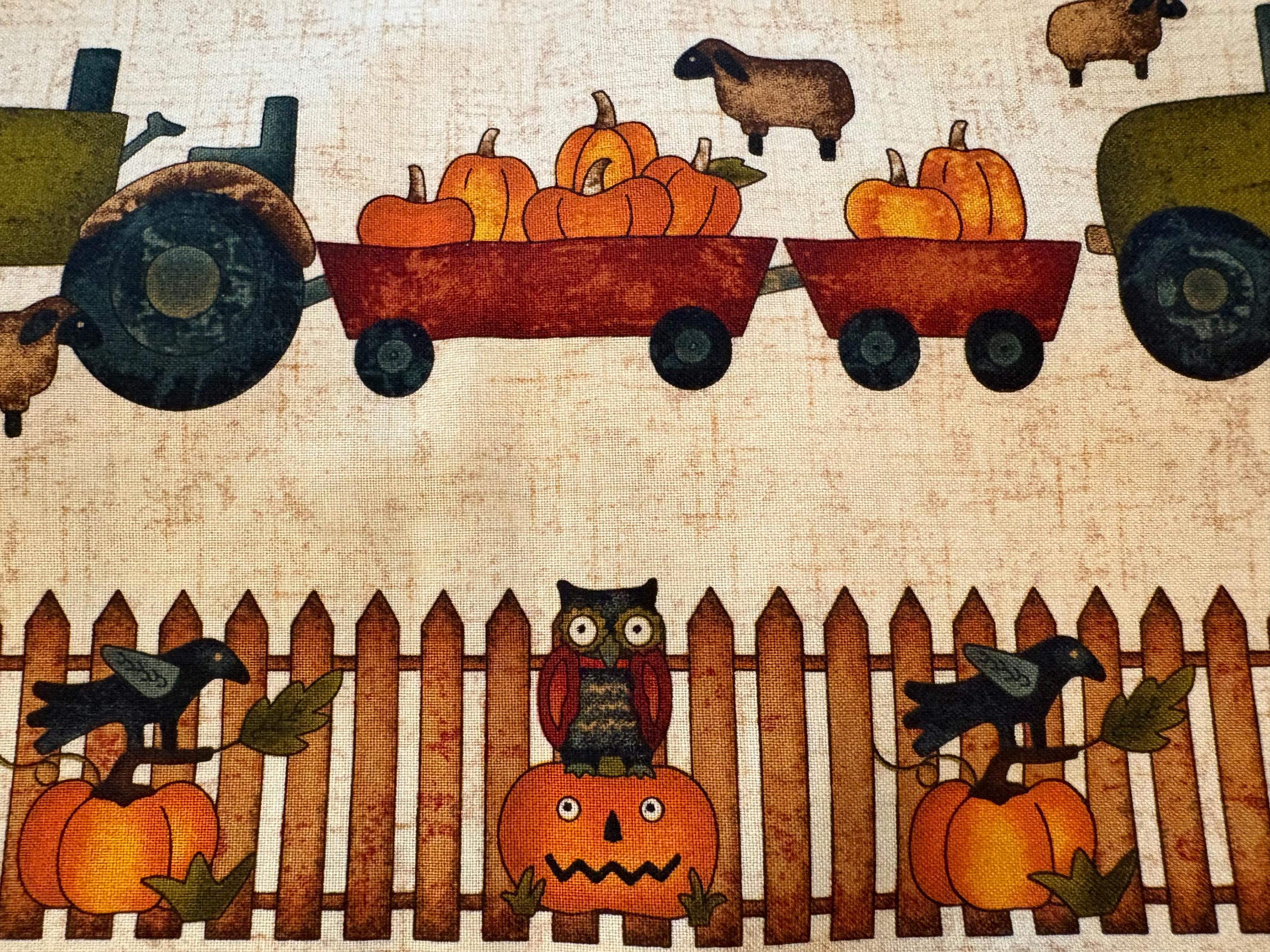 Fabric shows old farm trucks, tractors, sheep, corn, scarecrows,